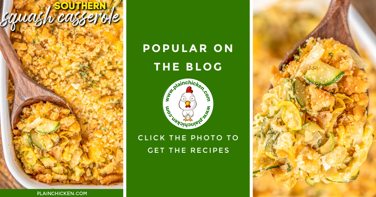 | | Southern Squash Casserole Recipe – seriously the BEST squash casserole recipe EVER! I took this to a cookout and it was the first thing to go! Fresh yellow squash, zucchini, onion, garlic, cheddar cheese, eggs, heavy cream, parmesan, butter, and Ritz crackers. Can make ahead of time and refrigerate or freeze for later. SO easy and everyone LOVES it! |
