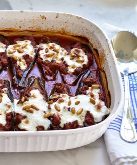 Make them as elegant "boats" or layered like lasagna. The assembly bakes for a couple of hours to meltingly soft, savory goodness. Find those buttery pine nuts here. And a story about Mom making this recipe for us here.