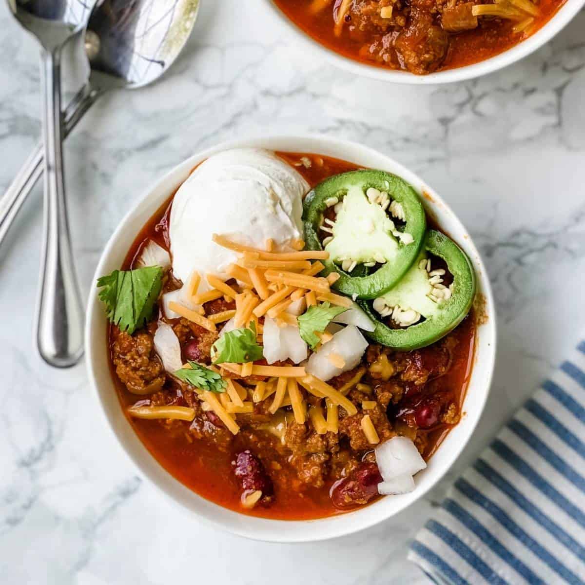 | Hey there reader! If you're on the hunt for an amazing Crockpot turkey chili recipe, look no further than this ⭐️⭐️⭐️⭐️⭐️ recipe! I've been making this recipe for years, and it's a favorite among my readers too. I'm a year-round chili girl, just like I am with soup, and this turkey chili is one of my go-to meals. Here are a few reasons why I think you'll love it too: Here's why you'll love it too: ✅ Low fat and filling! Made with lean turkey and beans to keep you full and satisfied without any guilt. ✅ Super tasty. Don't let the healthier twist worry you because this turkey chili has a fantastic flavor. ✅ Easy to prepare. The slow cooker does most of the cooking. ✅ Meal prep champion! Make a batch on Sunday for the week, or freeze it for future lunches or dinners. I like to make big batches of this chili and freeze it for quick lunches and dinners. In fact, it's one of my favorite freezer prep recipes and I even included it in my Freezer to Flourish Bundle.