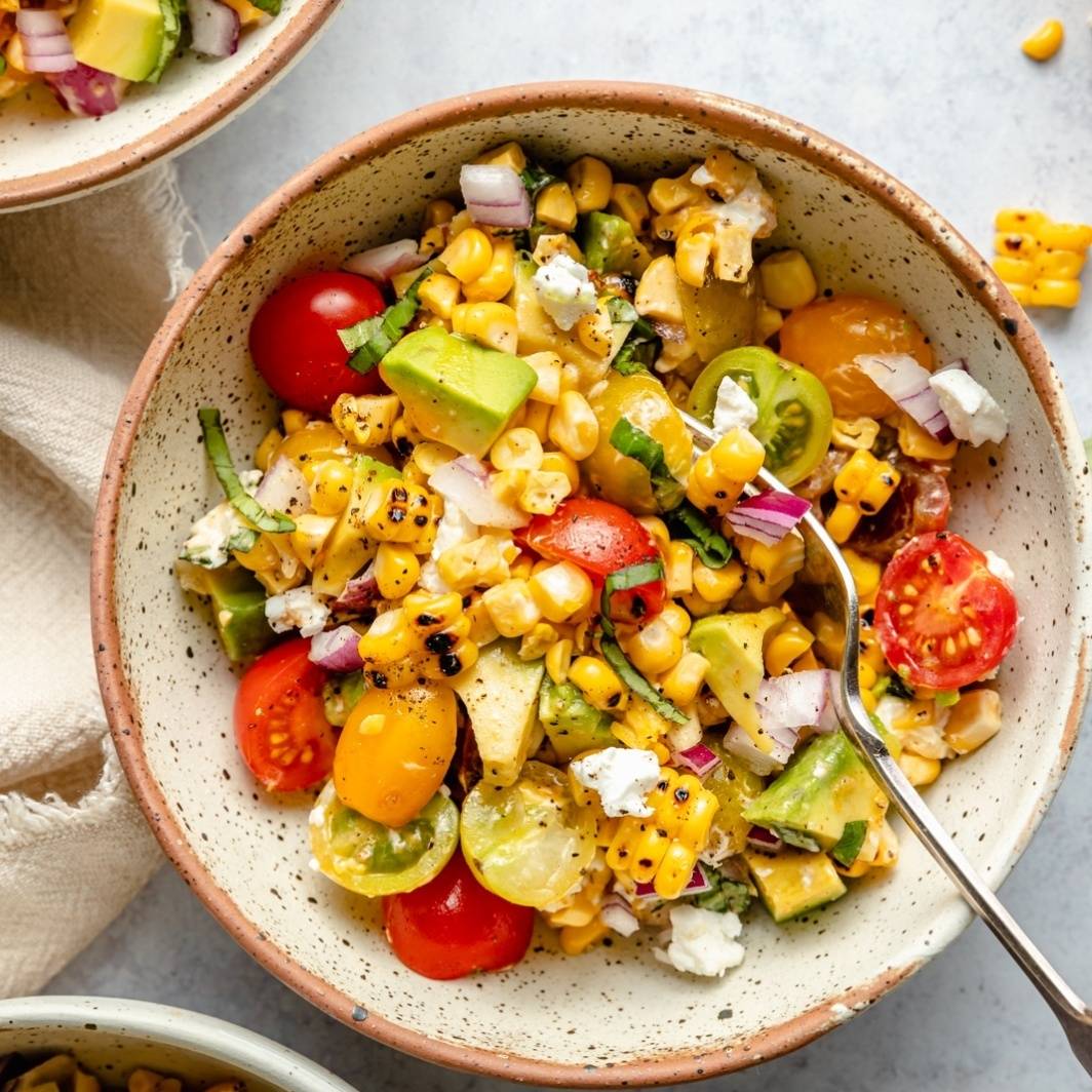 Grilled Corn Salad with Avocado, Goat Cheese & Hot Honey Vinaigrette This simple corn salad is packed with sweet and spicy flavors, plus tons of beautiful textures. Scoop it up on chips to serve guests or enjoy a delicious side dish with your fav proteins.