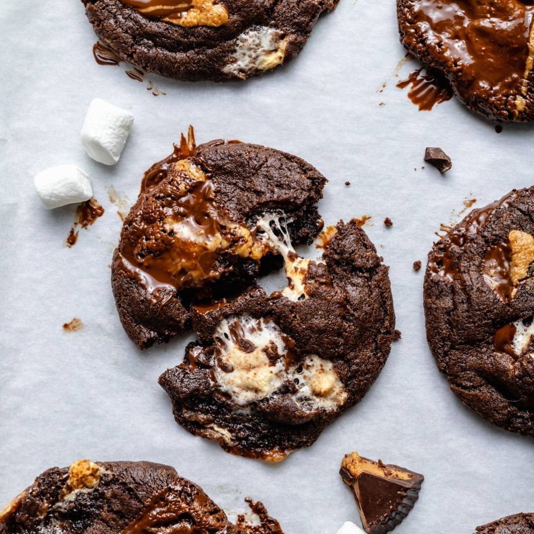 Dessert: Peanut Butter Cup S'mores Chocolate Cookies Because summer + s'mores = a match made in heaven. I mean, just LOOK at these ooey-gooey, fudgy chocolate cookies with puddles of chocolate, peanut butter, and toasted marshmallows. A guaranteed crowd pleaser at your next summer party!