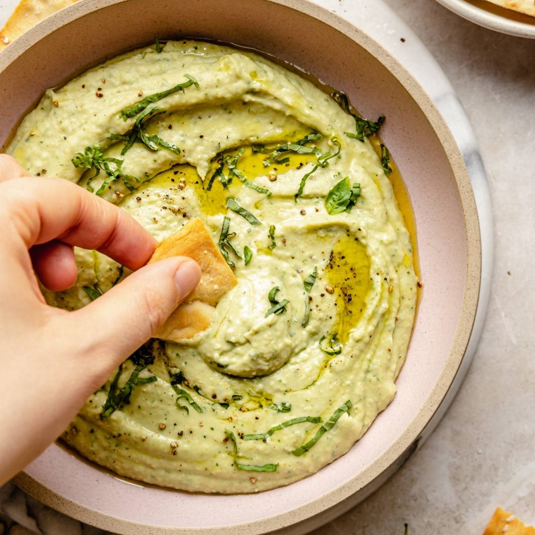 Snack: Garlic White Bean Basil Hummus Looking to use up all of those fresh herbs from your garden (or lurking in your fridge)? Blend 'em up with tender white beans to create this luscious, savory dip for pita chips, veggies, pretzels, and more. I love this as a sandwich spread, too.