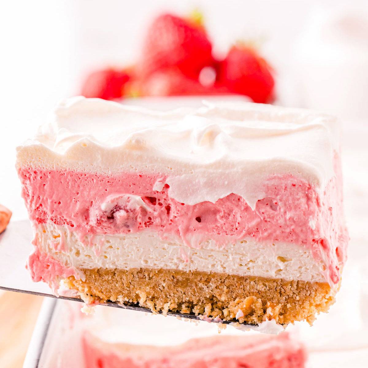 This Strawberry Lasagna is a delicious no bake, four layer dessert that is wonderfully refreshing, light, and oh-so-pretty! Layers of creamy cheesecake filling, sweet strawberry goodness, and a touch of buttery cookie crust, all topped whipped cream and fresh strawberries. It's the perfect dessert for potlucks and barbecues or simply satisfying your sweet tooth on a warm summer night.