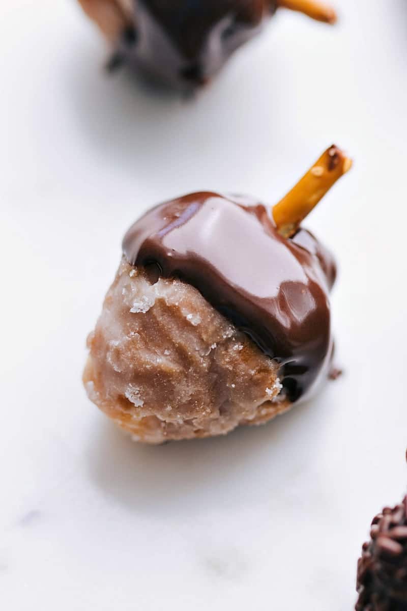 These caramel apple bites are so fun and easy to make. I love the crunch that the pretzel gives, and they're one of my son's favorite! Acorn Donut Holes