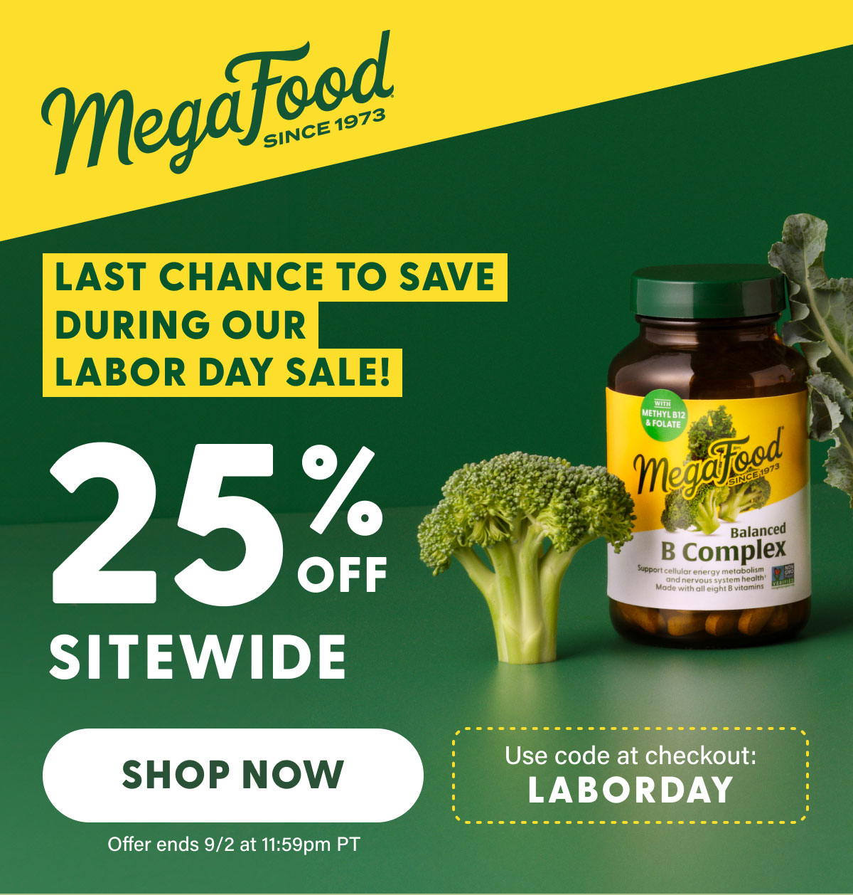 †These statements have not been evaluated by the Food and Drug Administration. This product is not intended to diagnose, treat, cure or prevent any disease. | | Order offer not valid toward shipping, handling, or tax. Offer is not retroactive for orders placed prior to receiving the offer. Not valid in combination with any other coupons, discounts, specials, vouchers, rewards points, redemption codes or promotions. Not valid in combination with any other coupons, discounts, specials, vouchers, redemption codes or promotions. Not valid on subscriptions. No cash value. Online orders only, not valid on retail store purchases, or orders placed with customer service via phone, email or other medium. Prices subject to change and valid while supplies last. Valid on orders from MegaFood.com only. Offer ends 9.2.24 at 11:59pm PT. If you are a California resident, please see our Privacy Policy found on megafood.com for information on how we collect, use and disclose business contact information and your privacy choices. | | No longer want to receive these emails? Unsubscribe.MegaFood® PO Box 5244 Manchester, New Hampshire 03108 | | | | |