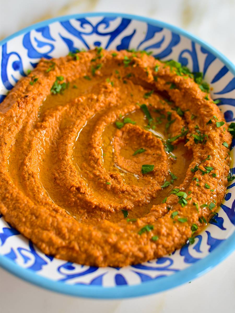 Muhammara is such a treat: roasted red peppers (which you can buy all set in a jar), toasted walnuts, panko, pomegranate molasses, garlic, and more. Watch it disappear!