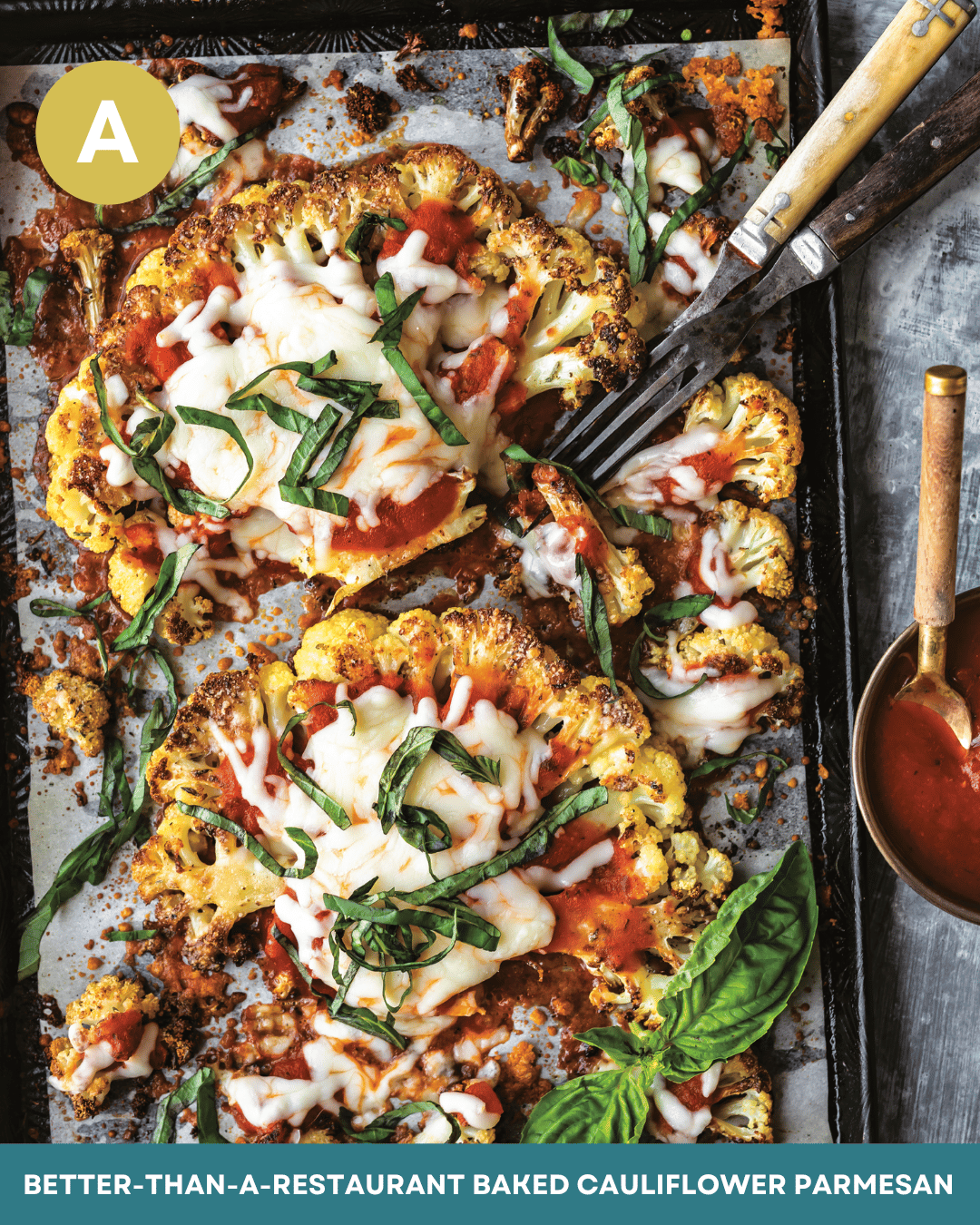 Bake the cauliflower on the center rack for 20 minutes. Remove from the oven and with a thin, flexible spatula, gently turn the steaks and florets over. Sprinkle the Parmesan over the top. Return the pan to the oven and continue baking until the Parmesan turns golden and the cauliflower is tender and caramelized at the edges, about 18 to 20 additional minutes. Remove the pan from the oven and turn the oven to broil.