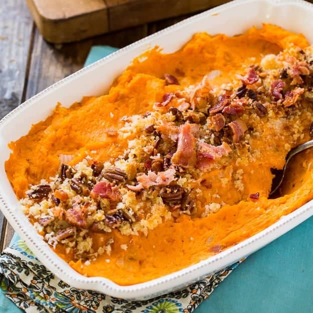 Savory Sweet Potato Casserole is full of onion, rosemary, and thyme and topped with crispy bacon and crunchy pecans. It also is flavored with gruyere cheese and cayenne pepper. If you find traditional sweet potato casserole to be too sweet, give this savory version a try. I think you'll like it!