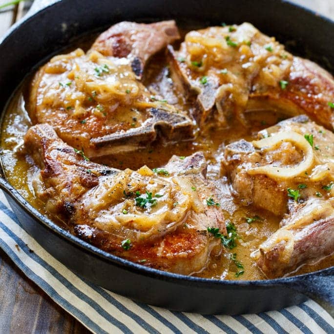 Smothered Pork Chops make a comforting, down-home southern meal, especially when served over mashed potatoes to soak up all of that flavorful gravy. Thick cut bone-in pork chops are covered in an easy onion gravy with just a touch of creaminess from some buttermilk.
