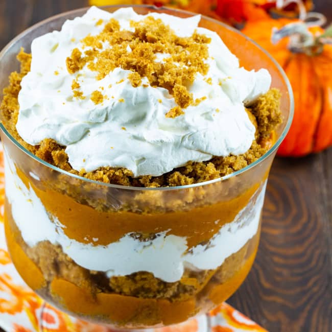 Butterscotch Pumpkin Trifle is a delightful fall and holiday dessert. Layers of crumbled spice cake, butterscotch/pumpkin pudding, and Cool Whip combine to create a gorgeous rich and creamy dessert.