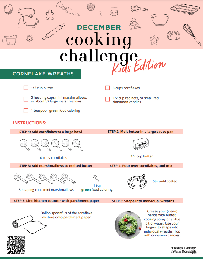 December's Cooking Challenge is Christmas Cornflake Wreaths! This kid-friendly recipe is perfect for the holiday season! We also have a printable picture recipe available for this cooking challenge, so your little chefs can easily follow along!✅