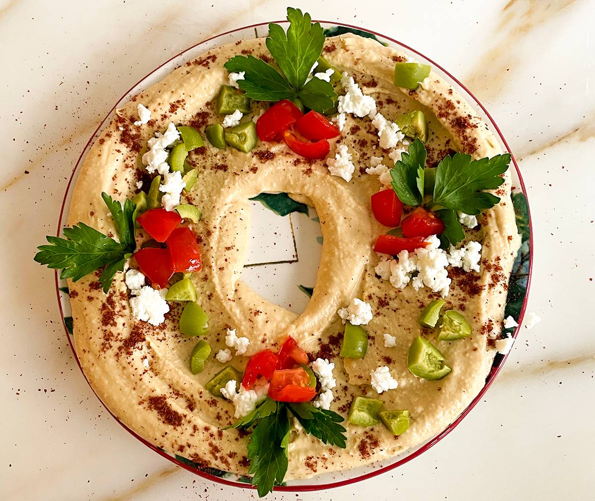 | ~ Adorable + Delicious ~ The Hummus Wreath is fun and easy! And such a festive way to dress up your hummus for the holidays. Use your favorite toppings or copy mine exactly: - Hummus spread on the plate wreath-style with a hole in the center