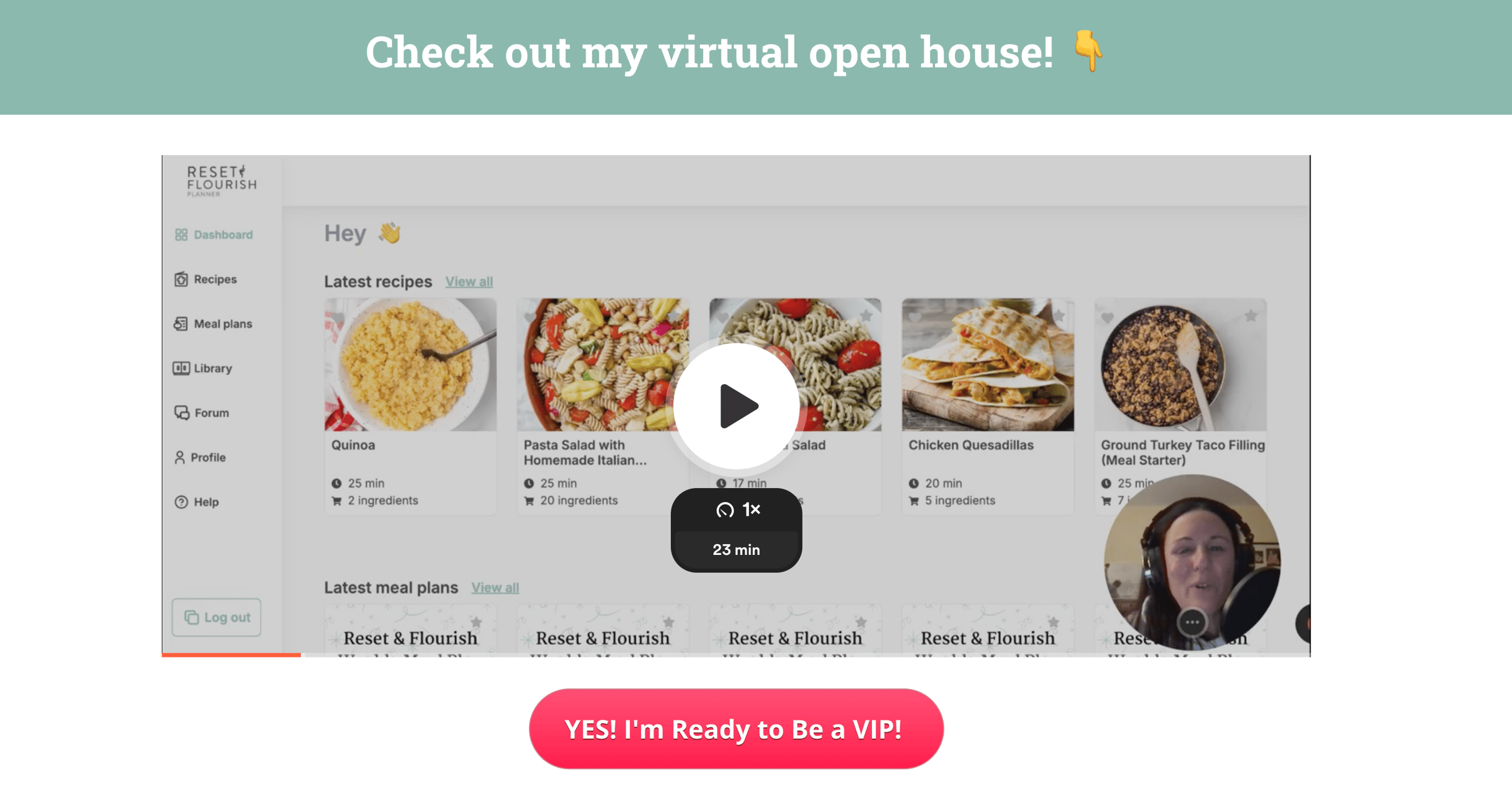 Real quick. Your membership includes access to the Reset & Flourish Planner, packed with over 400 recipes, a customizable weekly meal plan with prep-ahead tips, and a shopping list to simplify your routine. You'll also enjoy weekly habit challenges and motivational tools to help you start each week strong and ready to tackle your goals.