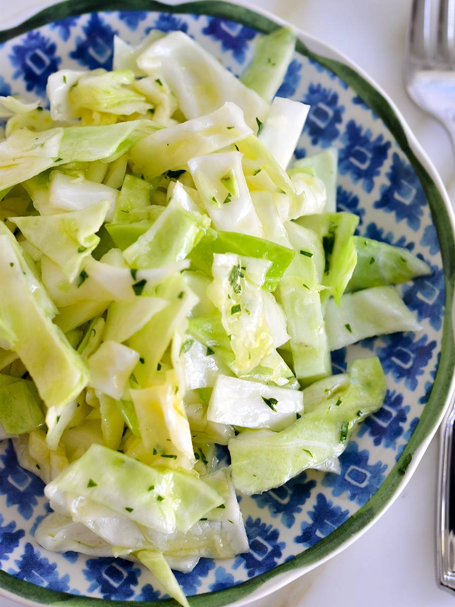 I love it for many reasons: head of cabbage is about all you need. Garlic, lemon. Flecks of parsley or mint or any herb really. It goes all week long in the fridge. Make a little bowl to crunch on, cold, as an easy lunch while gazing out the window.