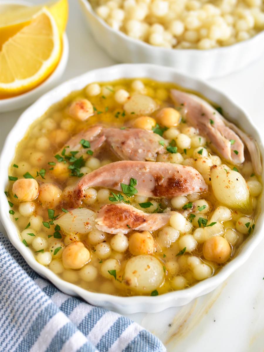 This favorite, moghrabieh, is often a New Year's dinner treat. You see Lebanese pearl couscous, chickpeas, and pearl onions in there. The broth is seasoned with warm spices. It's delicious and comforting and encourages the slow-down we need.