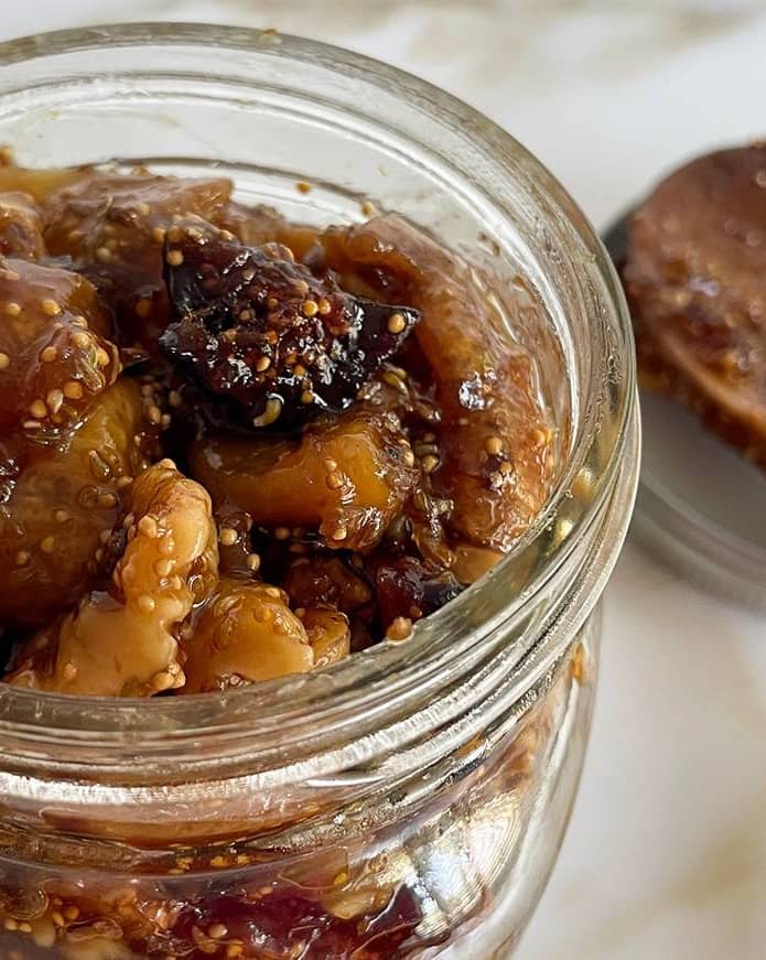 The flavor in this jam, and the wonderful texture, calms me down. Anise, walnuts, figs. A spoonful or two on its own or with toast or on a cheese board when we decide a little company makes the rest feel right.