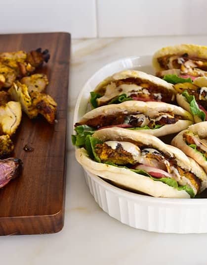 This hearty shawarma is made stovetop and turns into a perfect make-your-own set-up. The trimmings really add a lot: onions, tomatoes, pickles, fresh mint. Use pita as the wrap (add romaine leaves as no-carb alternative).