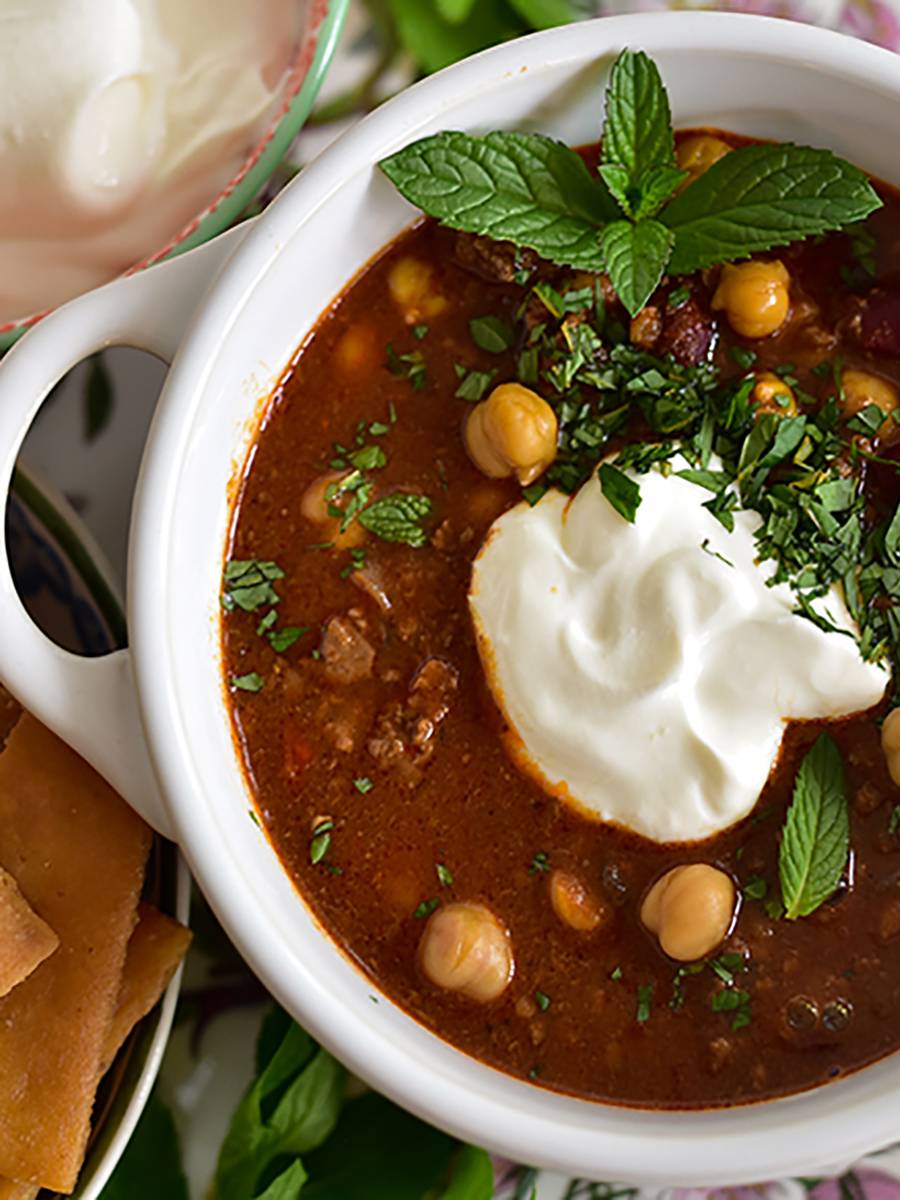 This tastes as good as it looks! That's labneh on top, chickpeas in the mix, and the tomato broth has hallmark Arabic flavor with 7 Spice seasoning. Ladle bowls of this with pita chips tucked in for crunch. Grab great 7 Spice in my shop.