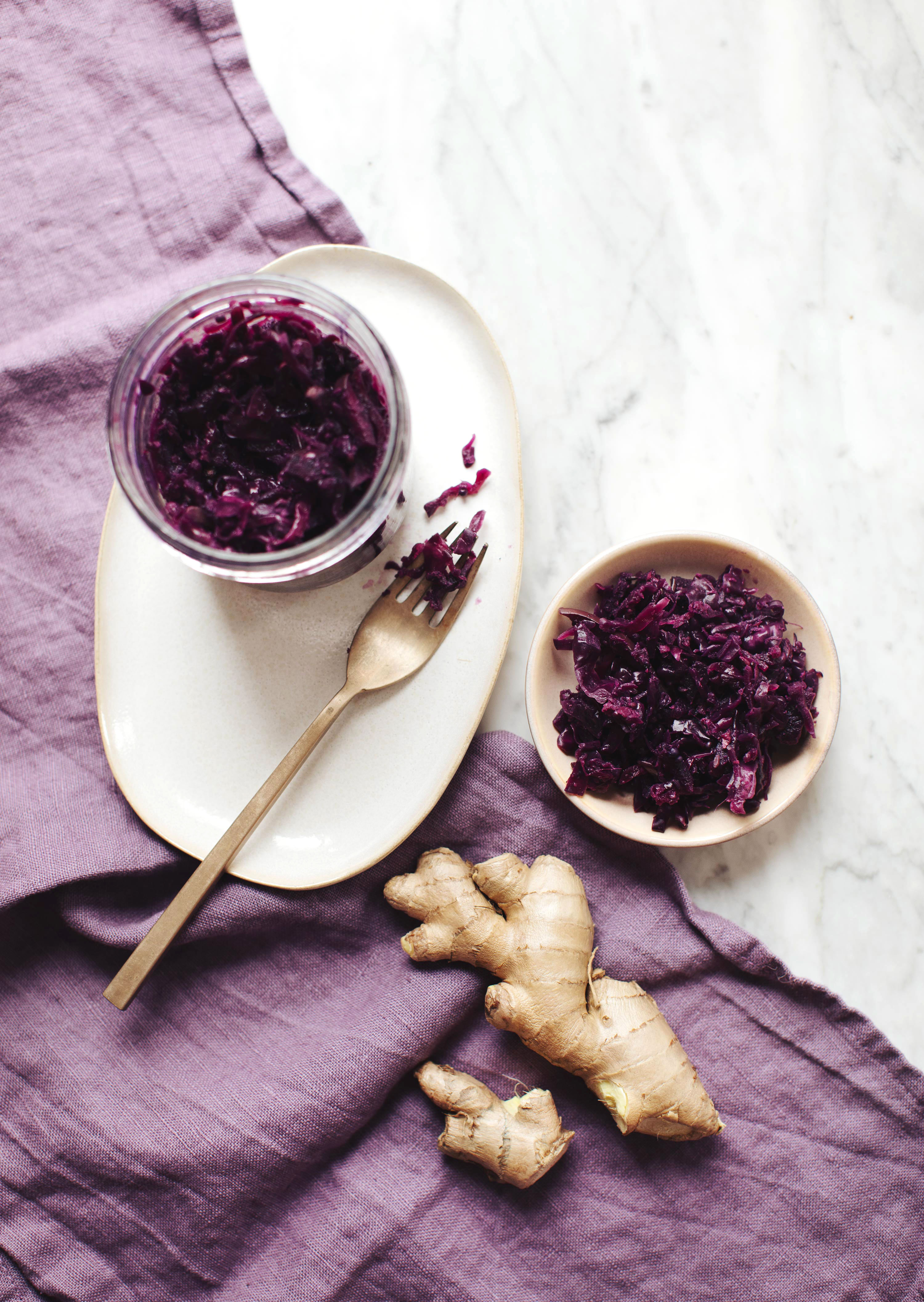 I developed the recipe below especially for the cooking class I taught at Goop, about a year ago. Everyone in the class loved it, but Gwyneth especially - and so it has become "GP's favourite" Purple Ginger Sauerkraut in my household - what can I say - the woman has exceptional taste! So I hope you're as "obsessed" as she is, and that you find it easy enough to fold into your monthly repertoire. I like to make a jar every few weeks to ensure that I always have a homemade ferment on hand to complement all of my meals. This one, due to the ginger, is less neutral than other versions, but I like the distinct spiciness of this addition, and it's particularly delicious with sesame-spiked dishes, mushrooms, lemongrass, lime, and chilies. If these are ingredients you work with regularly, then this sauerkraut will be a welcome flavour blessing.