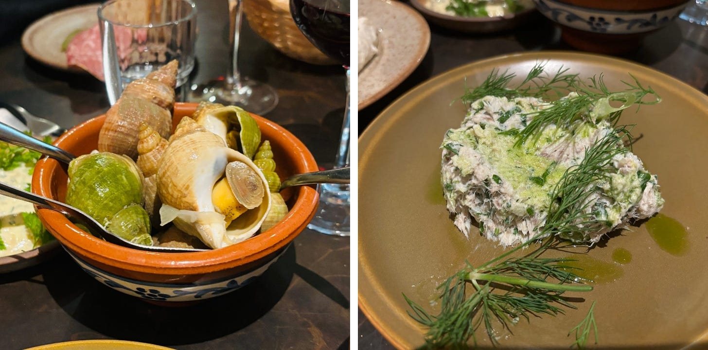 I started this post a few months ago, then a lot happened. I added some places to it, seasons changed, and it’s position in my Drafts folder kept going further and further away from me. Yet the city kept going, and restaurants, chocolate shops, and bakeries continued to open, each wave bringing more talent to the forefront. In related news, I recently saw that the French are the third-largest consumers of spices in Europe, which isn’t a big surprise due to all the cultures and colonies, although to the surprise of many, spicy (as in spicy-hot) cuisine is taking off in Paris (video in French): In the meantime, about a month ago I decided to hit more of the new places that have opened up, or places I’ve wanted to go but haven’t gotten to yet. You can find previous places that I’ve written about in my Paris Dining Archives here in the newsletter, and more in the Paris Favorite Restaurants section of my website. As the dining scene in Paris, and tastes, continue to evolve, here are some of the places I’ve eaten at recently… GibonThe best way to experience Paris is by bike or by foot, because you get a feel for what’s going on in the streets, and see what’s opening and where people are eating. Located not far from where I live, Gibon is on a side street, and like many side streets in Paris, it’s used by cars and motor scooters to test out how fast they can accelerate, so they can get to the next stop light faster. Riding in the bike lane on my bike (many bike lanes in Paris go in the opposite direction of traffic), I’m often face-to-face with cars gunning it toward me, and it’s a constant game of chicken on that particular street to see who will move first. So I’m usually not looking at storefronts but fearing for my life. But I noticed Gibon and decided to go in when a friend came to town. Just one year old, we ducked into Gibon on a(nother) rainy night for a glass of wine and a little something to eat. We had a mineral-rich Macon, then, sticking with the mineral theme, followed that up with glasses of muscadet, a wine from the Loire-Atlantique that is a natural pairing with oysters. While there weren’t any oysters on the menu, we did have an excellent sausage in brioche, fried until golden brown, hot, and crispy, and their take on tarama (known as taramasalata elsewhere), made with haddock, with thickly cut levain bread to dip into it. My friend had dinner plans elsewhere, and I vowed to go back. Which I did when the food styling team and photographer came to town to work on my next book (out next Fall), and we had mackerel rillettes (below right), a spread enlivened with capers and lots of fresh dill, an herb that doesn’t get enough use in France, except with salmon. There were also thin slices of fennel-scented dried sausage, bulots (sea whelks), a very nice bowl of crisp sardines tempura with ponzu sauce, and Gnudi with ‘nduja (shown above), which was one of the spiciest things I’ve had in a French restaurant. Which isn’t a complaint! ![]() From the looks of things, most customers are from the neighborhood, and I even ran into my friend Jennifer while there, who leads cheese and wine tastings and who recently moved to the neighborhood, and she likes it too. One of the owners often waits tables, and the last time I was in, he offered us a taste from a bottle of wine he received from a new vineyard, which was their very first bottling. We agreed it was drinkable and had potential, and Gibon is certainly living up to its potential as being a nice, neighborhood wine bar and restaurant. Gibon DatilWhen I started writing cookbooks and was getting asked to describe my style, someone in the media told me not to say “local and seasonal.” Their reasoning was that everybody was saying their cooking was “local and seasonal,” whether they were doing it or not. And you’d get lumped in with those people. Datil bills itself as local and seasonal:
