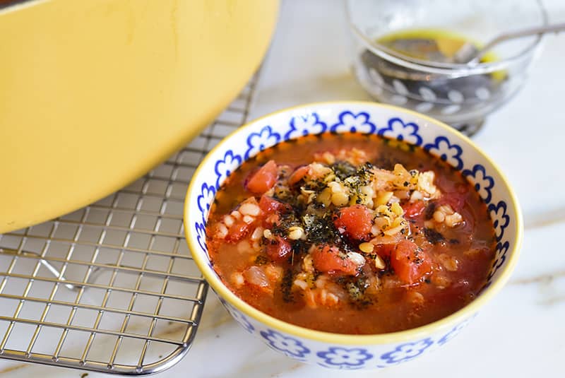Another soup favorite: this lentil soup is tomato based, with red lentils and that ultra-healthy grain, coarse bulgur.