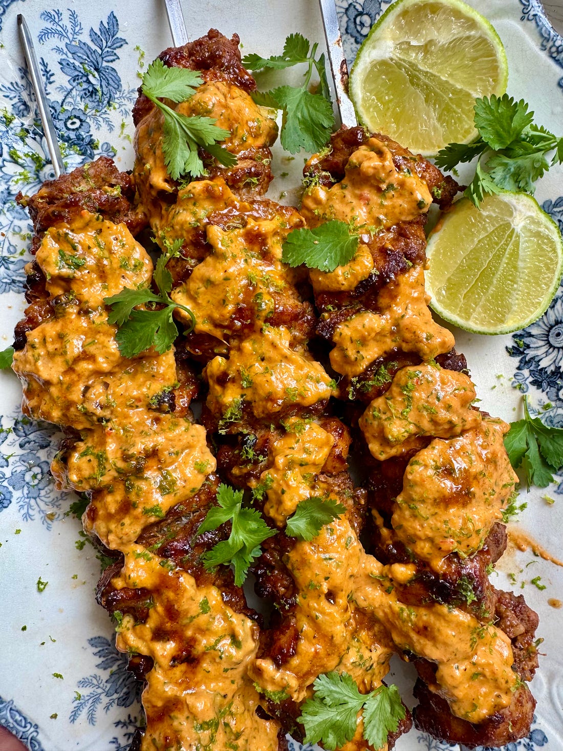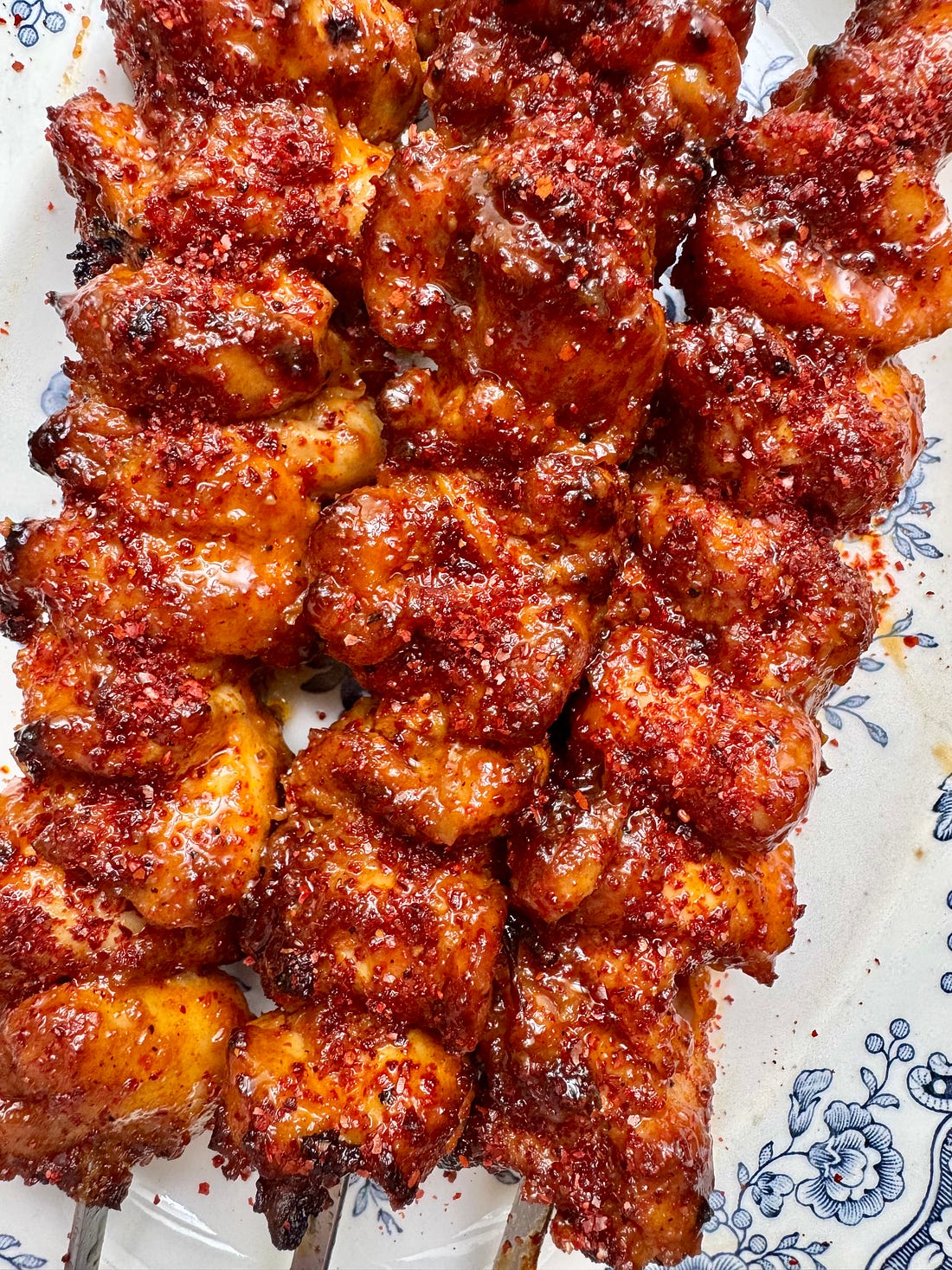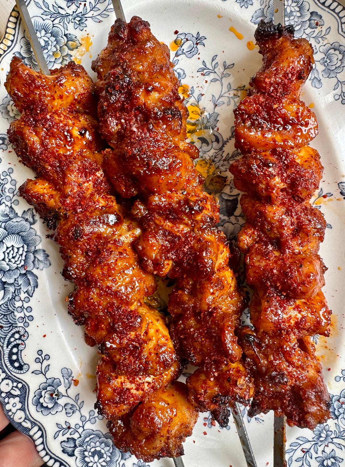 Flavour nugget #34: an essential BBQ chicken skewer recipeA little spicy, a little sweet, goes with everythingIt’s been HOT in London. Perfect BBQ weather. Almost makes me wish I’d released a BBQ book this year instead of last year, when we had approximately two days of sunshine. ANYWAY. It’s been mostly glorious, and the only way to eat is to sack off cooking entirely, or gather your mates, sling some drinks in an ice bucket and do it all outside. If there’s one thing I know about planning BBQs, it’s that people want chicken (insert obvious dietary disclaimer). I come to you today, then, with an essential chicken skewer recipe that will see you through peak season. This is based on my chilli chicken recipe (which I more often make with fish, what is life!), but here I’ve toned down the heat and made it a little sweeter and stickier. It also uses ingredients you’ll likely have already, which is always a win. If you’re thinking: I want a chicken kebab to go with a chopped salad of cucumber, tomato and perhaps coriander, a dollop of yoghurt, Bob’s your uncle - this is the kebab for you. Or, if you want a chicken kebab to go with some pitta bread, bit of coleslaw, some potatoes maybe with herbs running through them - this is the kebab for you. Or perhaps you want a chicken kebab to roll inside a naan or flatbread, bit of mango chutney and raita. This is…etc, etc. A few points to note. First, use thighs. Chicken breast is easy to dry out, especially over coals, and while you can briefly brine it, why bother when chicken thighs have so much more character? Their kebabs are strings of gelatinous nuggets! The chicken is giving you the gift of flavourful meat - don’t refuse it. Using a tenderising ingredient in the marinade also guarantees extra succulence. There are options when it comes to tenderising meat, including using an acid (vinegar, citrus, yoghurt) or an enzyme such as those present in certain fruits (pineapple, papaya, kiwi) or - as I’ve used here - good old onion. You must also use salt. A marinade won’t penetrate far below the surface of the meat anyway, but it won’t penetrate *at all* if you don’t add salt. And then, the cooking. Your coals should not be burning with flames when you come to cook your skewers. Hot embers are what you’re after; grilling the chicken gently will ensure it heats through while hanging onto its juice. You’ll also be able to achieve some light char on the outside, too, which is part of the fun of BBQ cooking! Don’t miss out. Finally, I’ve used a baste - a simple mixture of olive oil, lemon juice and maple syrup. This ensures the meat achieves maximum sizzle on the outside and encourages tackiness and char. You’ll also feel like a pro while doing it. Ready? Good. Here’s the recipe. Essential BBQ Chicken Skewers Recipe #1 8 boneless, skinless chicken thighs, diced into bite-sized pieces Baste