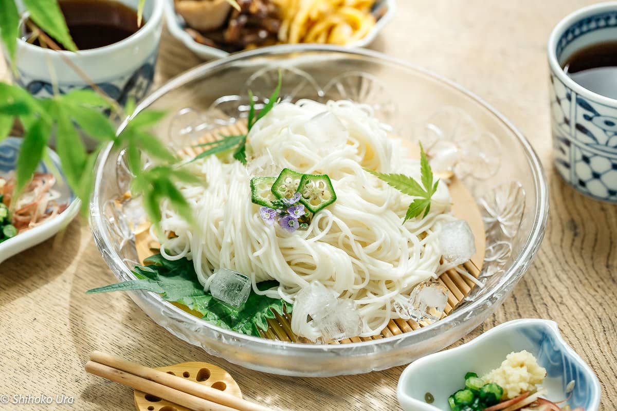 Somen are thin, white Japanese wheat noodles served chilled with a light dipping sauce—perfect for hot summer days. Quick to cook and very simple, this refreshing dish is often served with green onions, ginger, and a variety of thinly sliced toppings for a satisfying and cooling meal.