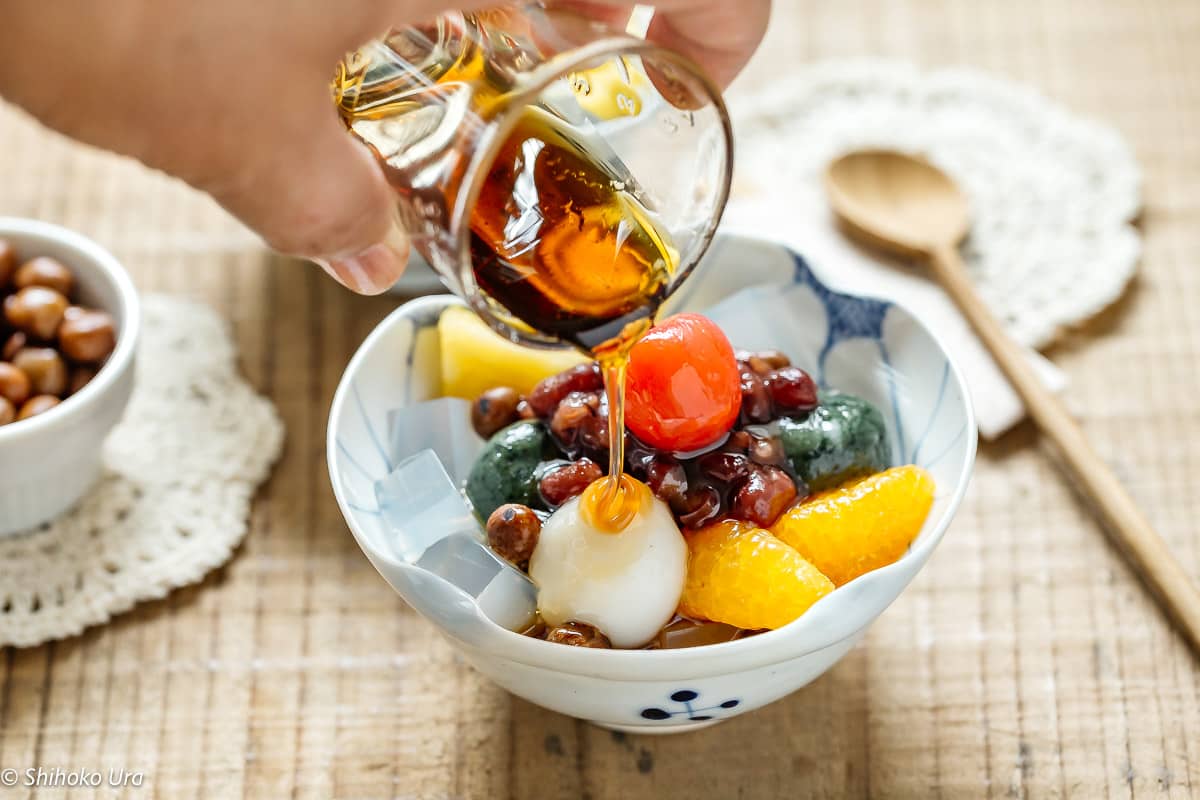 Anmitsu is a classic Japanese summer dessert made with cubes of kanten jelly, sweet red bean paste, fruits, and mochi, all served with a drizzle of black sugar syrup (kuromitsu). Light, colorful, and refreshing—it's the perfect way to cool down on a warm day!