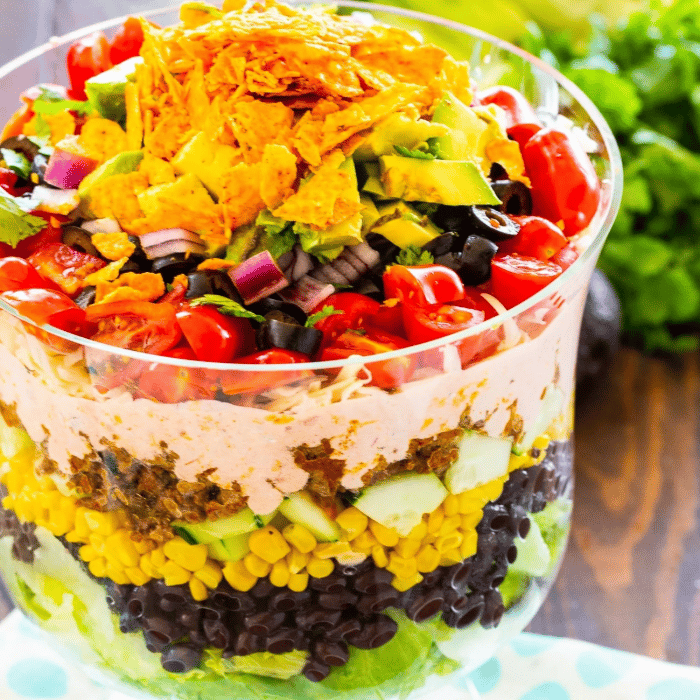 | Layered Taco Salad Layered Taco Salad has all the flavors of tacos piled on top of each other in a trifle dish. It's easy to make ahead for a potluck or party and it will feed a huge crowd. Peach Cobbler screams summer to me. Juicy and sweet tree-ripened peaches surrounded in a buttery crust and topped with vanilla ice cream is as good as it gets as far as summer desserts are concerned. MORE RECIPES TO TRY Bacon Caprese Salad- a caprese salad tastes even better with the addition of salty, crunchy bacon pieces. Such a great summer recipe! Ginger Sesame Cucumbers are a refreshingly healthy side dish with lots of Asian flavors. With tons of fresh ginger, these cucumbers definitely have some zip. S'mores Bars are so simple and so delicious. There's a buttery graham cracker crust, a layer of Hershey bars, topped with marshmallows and more chocolate. Crock Pot Chipotle Pulled Chicken makes the perfect base for quesadillas, burritos, nachos, salads, or it's delicious served on a bun with coleslaw. Tender pieces of shredded chicken are swimming in a flavorful sauce that is smoky, sweet and spicy. Green Bean and Yellow Squash Saute makes a tasty side for dinner. Easy to make, it's flavored with Italian seasoning, roasted red peppers, and a few crunchy pecans. |