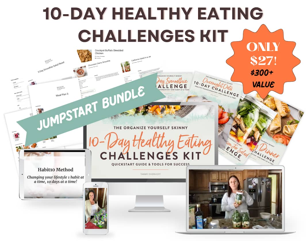 ✅ 4 Quick 10-Day Challenges Smoothies, Mason Jar Salads, Overnight Oats, and Healthy Dinners. Each challenge builds on the last—so by the end of the month, you've layered habits that feel automatic.