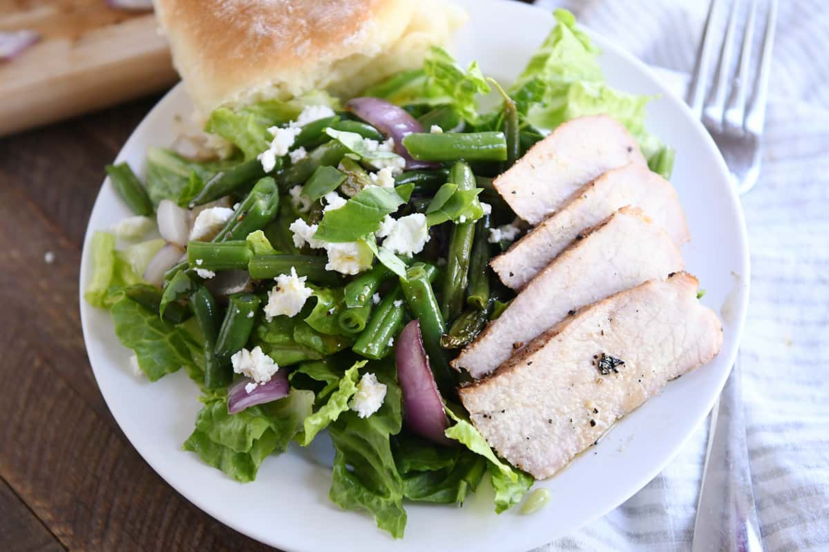 Use extra chicken from the souvlaki meal above - or keep it meatless. If you make the grilled pork and veggie salad below, you could make extra green beans and serve it here.