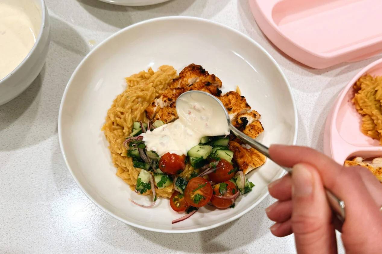 High protein, high flavor! Air fryer chicken nestled into a steamy bowl of perfectly chewy chickpea Banza. The sauce on top is a calabrian chili sauce and it really just makes the whole thing sing!