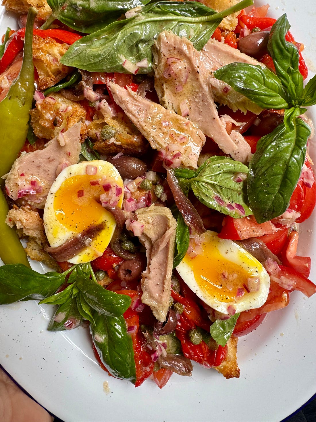 Do you ever imagine yourself as a character in a film or TV show? This year I’ve been in a cheesy box set, having a dreamy, scorching summer which I desperately don’t want to end. On the other hand, I’m mopey and creatively stuck. It might sound silly - childish, even - but imagining oneself as a character is a solid coping mechanism. It helps to gain perspective on a chapter in your life and see it for what it is - transient. It’s not something to be endured, but to fully experience and reflect upon. I’ve been mulling this over, I think, because the changing of the seasons always feels like an introspective time. I’ve just been sitting in a favourite spot in the park, overlooking people in groups down below, eating this salad I made earlier. It’s emerged as my go-to location for taking stock, not least because there’s often an angry gaggle of geese wandering through, hissing at passersby who get too close. It’s extremely entertaining. The geese flanked me on one side, while a group of Russian women smoking weed chatted incessantly on the other. For some reason, I found this relaxing. Please join me in channelling zen, by which I mean don’t be offended by this week’s mashup of two classic salads (you’ll have heard about cacio e pepe gate); I am not here to offend either the French (niçoise) or Italians (panzanella) but only to share a recipe that has brought me joy and may therefore do the same for you. I promise you, the salad slaps. I’ve combined the best fishy bits (good-quality tinned tuna and anchovies) with the ripest summer tomatoes and fennel-roasted peppers (this week’s nugget), plus the signature rustic croutons of the panz, perfect for sopping up a bolshy shallot dressing. The eggs give it some structure, by which I mean they fill you up. If you’re making it ahead, for the next day, say (it will keep very well), then do your eggs separately and chill them unpeeled before adding to the salad later. I was forced to leave my grassy outpost as rain clouds gathered and the geese seemed to sense something was up. The end of summer, perhaps? The following day delivered full sun, and I basked in a mate’s garden like a lizard, absorbing every last ray. Continue reading this post for free in the Substack app |