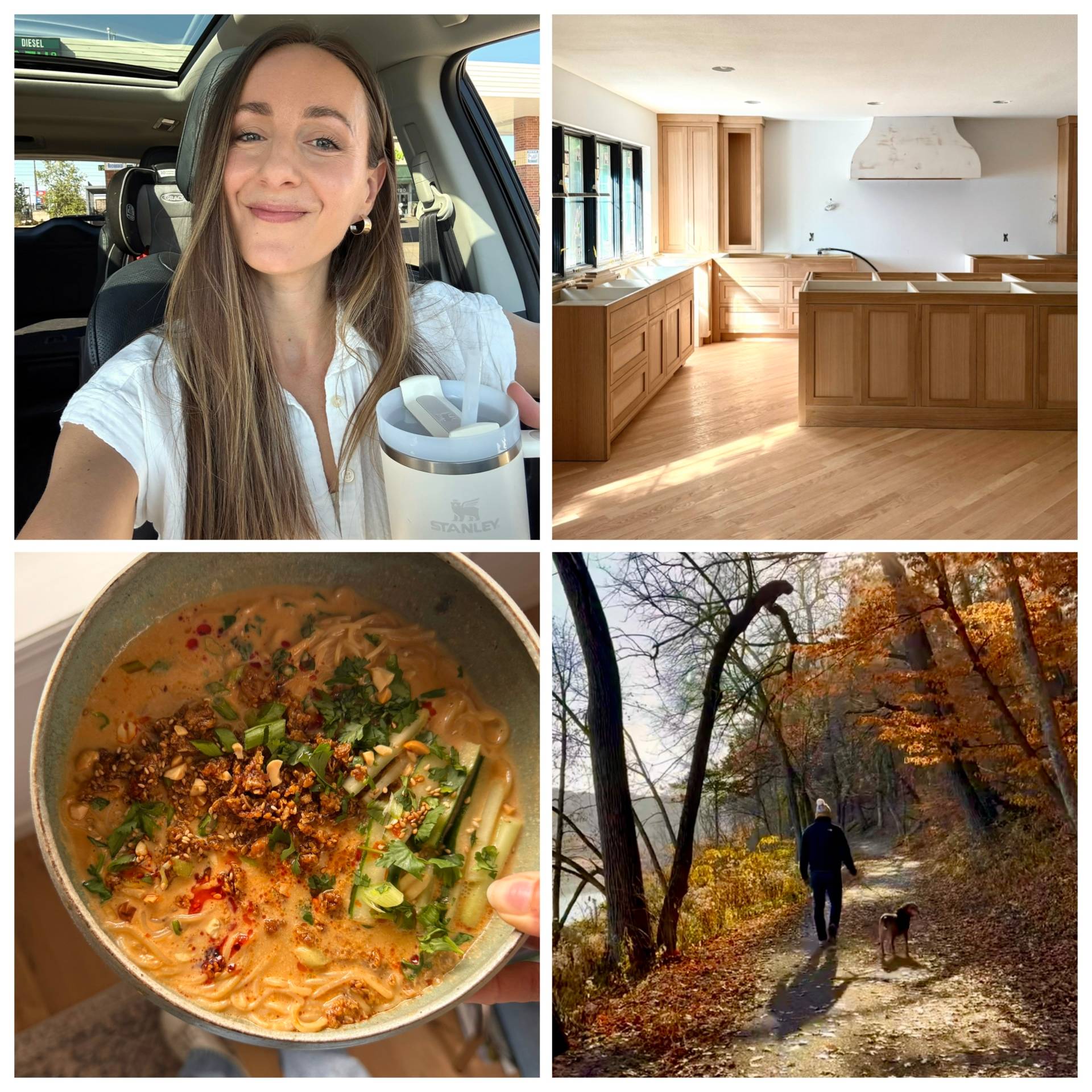 (clockwise) Me feeling happy with fall weather, kitchen progress, my two best fall walking buddies, and the miso peanut ramen bowls,