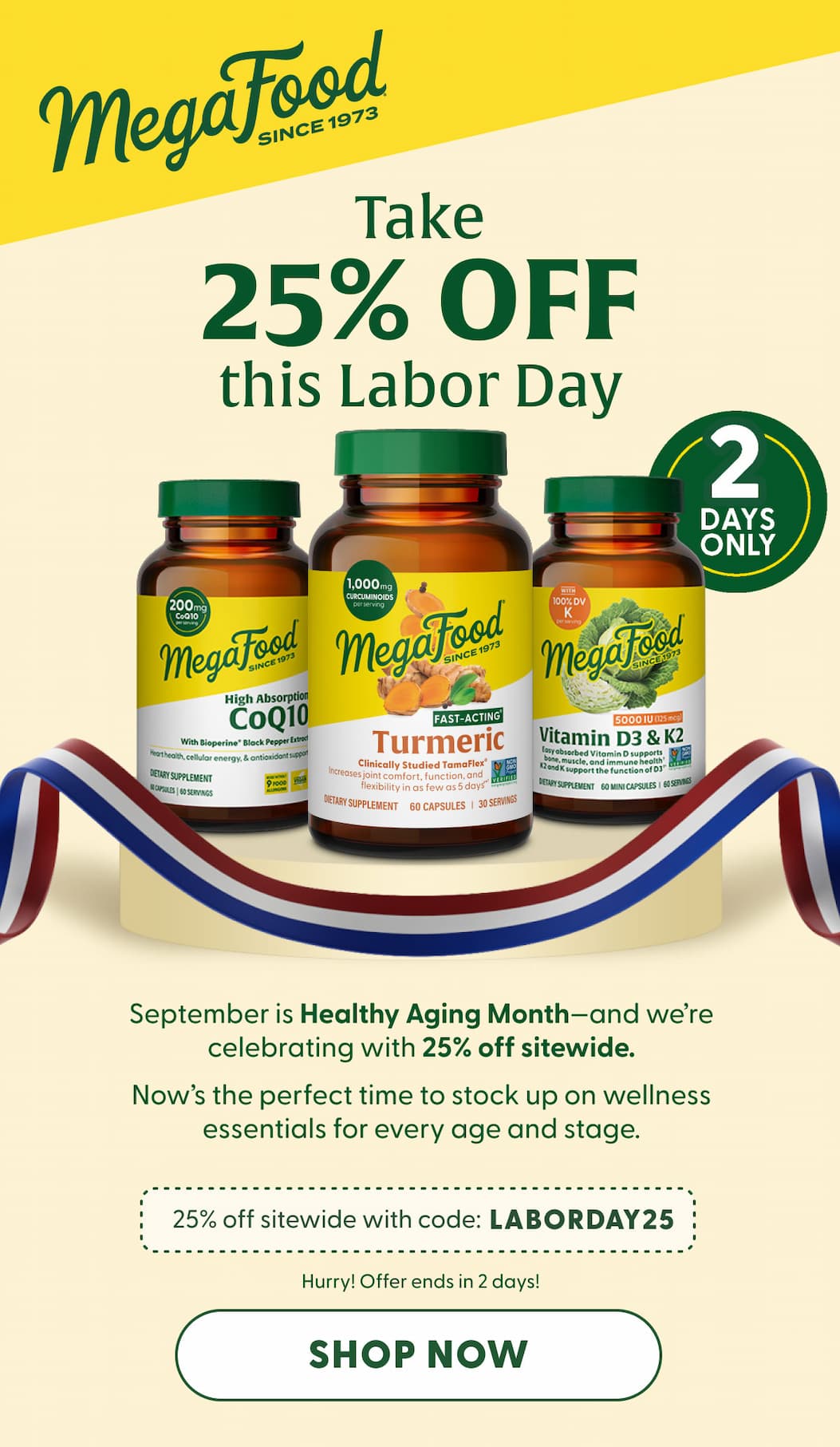 †These statements have not been evaluated by the Food and Drug Administration. This product is not intended to diagnose, treat, cure or prevent any disease. | | 1 Formulated with BioPerine Black Pepper Extract to enhance absorption. BioPerine® is a registered trademark of Sabinsa Corporation 2 TamaFlex® is a registered trademark of NXT USA, Inc. U.S. Patent #11,147,850 3 A clinical study showed an increase in joint comfort, joint function and flexibility in adults between 40-70 years old with mild to moderate joint discomfort in as few as 5 days. Offer not valid toward shipping, handling, or tax. Offer is not retroactive for orders placed prior to receiving the offer. Not valid in combination with any other coupons, discounts, specials, vouchers, or promotions. Not valid on subscriptions. No cash value. Online orders only, not valid on retail store purchases, or orders placed with customer service via phone, email or other medium. Prices subject to change and valid while supplies last. Valid on orders from MegaFood.com only. Offer ends 9/2/2025 at 11:59 pm PST. If you are a California resident, please see our Privacy Policy found on megafood.com for information on how we collect, use and disclose business contact information and your privacy choices. | | No longer want to receive these emails? Unsubscribe.MegaFood® PO Box 5244 Manchester, New Hampshire 03108 | | | | |