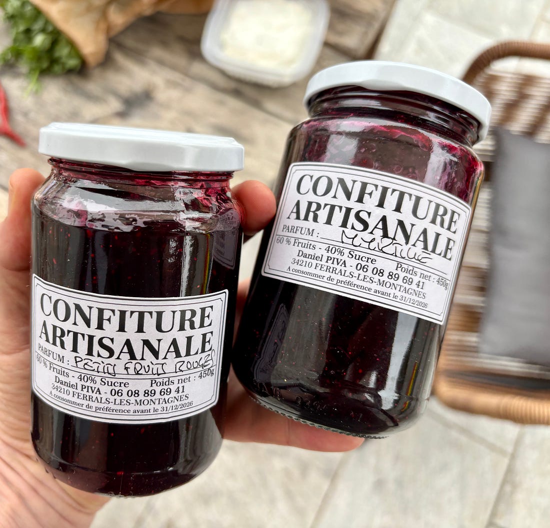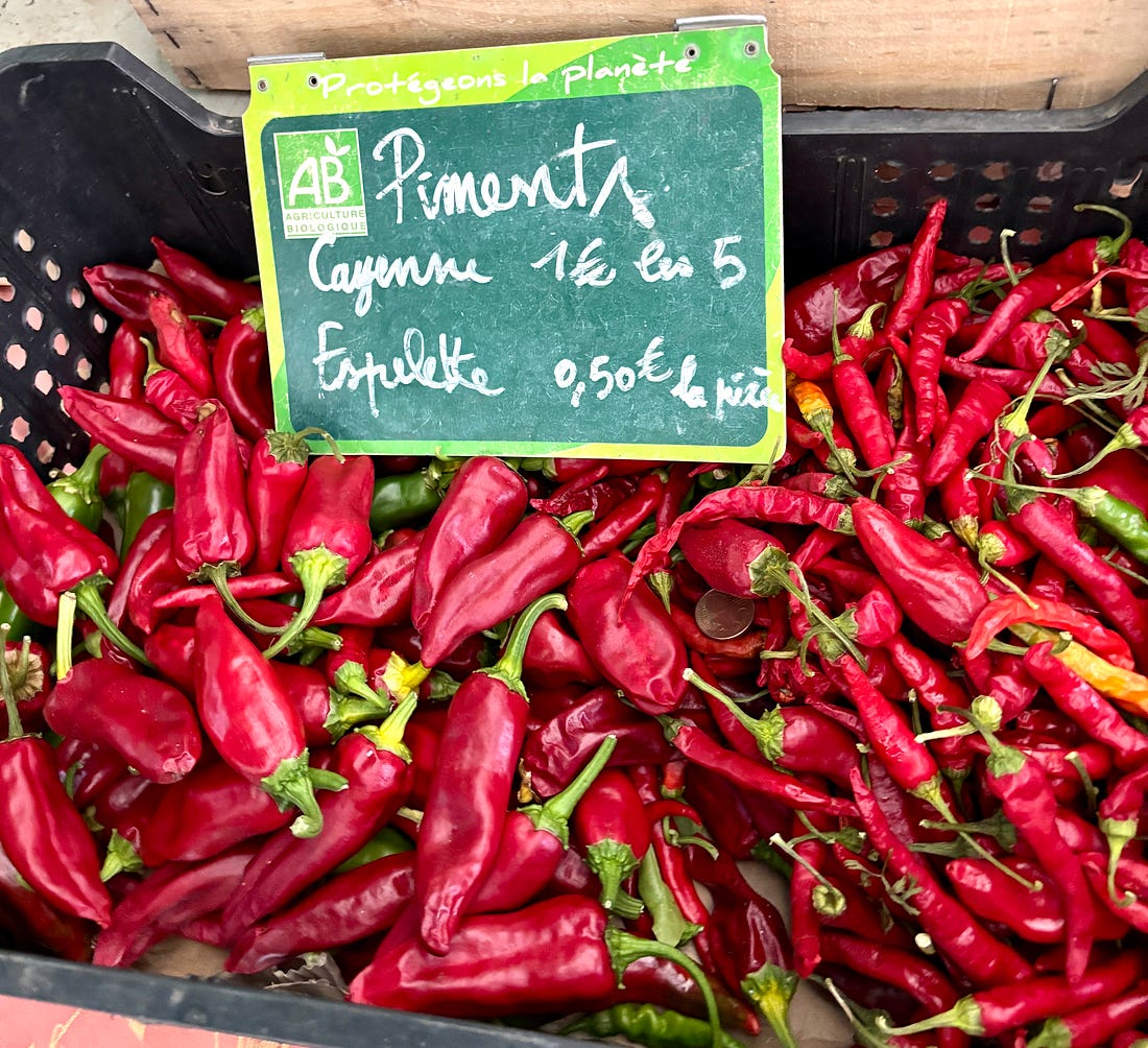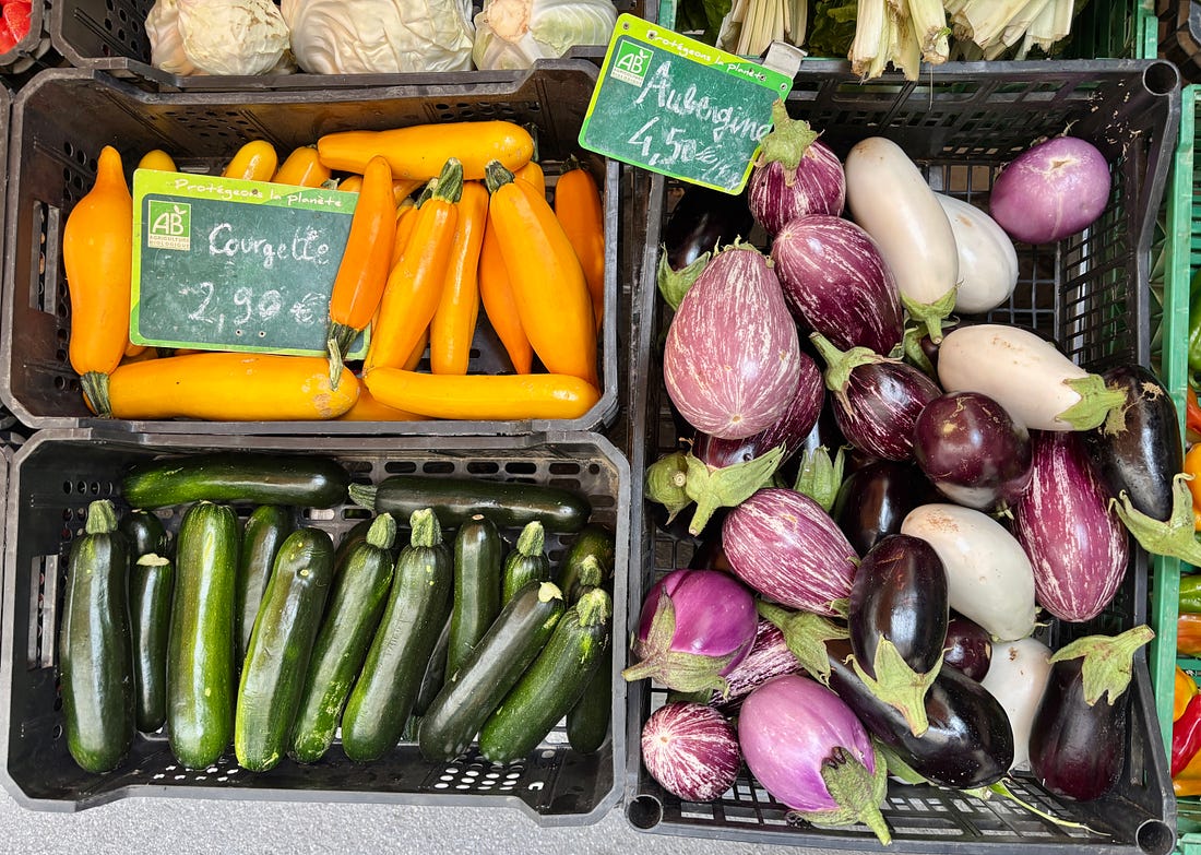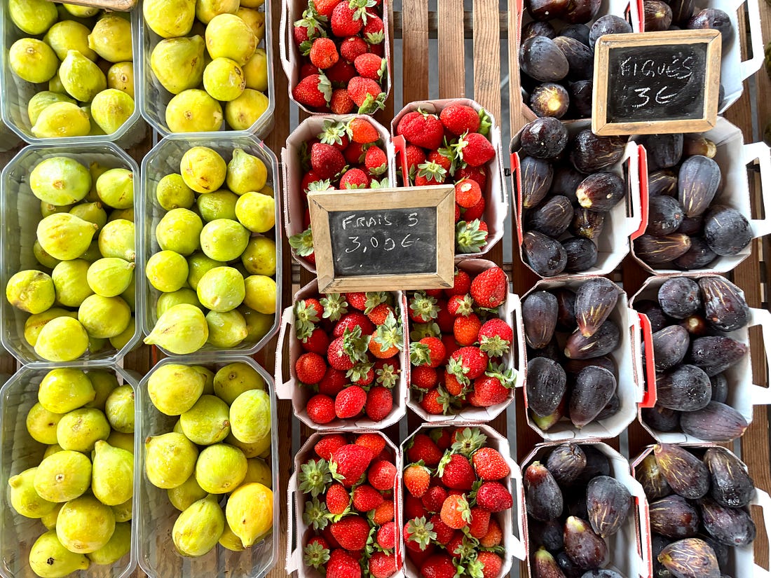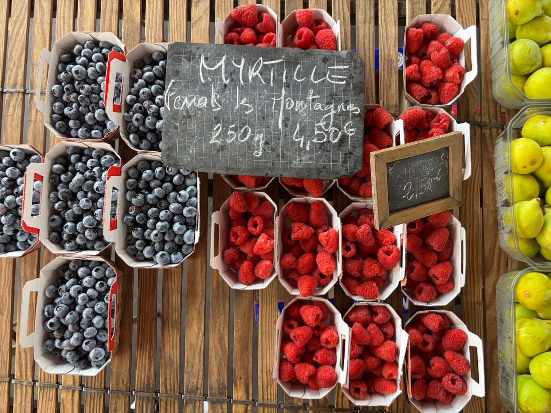 While I generally send out a monthly newsletter on the first of the month, we are out and about, enjoying a little vacation time. Unlike the juilettistes and aoûtiens, people in France who take their vacation in July or August, we like to take ours at the end of August, rather than in the middle of summer. Since we don’t have kids, our schedules aren’t tied to school vacations, so we’re free to go when we want to. Places are also a lot less crowded as summer draws to a close, which to me, means it’s a great time to travel. L’Occitanie (Occitania) doesn’t get the same publicity as Provence, but it’s the southernmost region of France, and the Languedoc-Roussillon is the largest winemaking region in the world. We started coming here during Covid-19, when the country’s borders were closed and a good friend who used to live in France, but moved back to California, couldn’t make it back and kindly gave us her guest house to vacation in. We’ve been coming ever since. One highlight of coming to the area where we’re staying is the market in Olonzac, which takes place Tuesday mornings. Unlike the markets in Paris, which don’t get going until 9am or so, people arrive at this market early and we try to be there by 8:30am, before it gets too crowded and all the good stuff is gone. The produce at this market is truly gorgeous and almost all of it is sold by producteurs, producers who actually grow it, rather than négociants, middlemen who buy and resell produce at the market. So the quality is really high and everything is super fresh and packed with flavor. One specialty of the region is pink garlic, which is dewy pink and rock-hard, and is sold tied in bundles. Because of the way it’s dried, pink l’ail rose keeps for months and we always buy a few bunches to bring back to Paris, which we use in the fall and even in the winter. Romain can’t resist girolles (below), and while many that are sold in France come from other countries, people prefer to buy wild mushrooms from France. Some of it is a holdover of concerns that mushrooms grown elsewhere contain radiation from Chernobyl, so buying ones that grew in France, to this day, is more reassuring. We bought a few baskets of them, along with eggs from a local producer (6 eggs for €1,90, about $2.25), to make an omelet. Unlike some people, I don’t really feel the need to do a lot of cooking while on vacation. When a chef turned his nose up at us at Chez Panisse, calling what we do “shopping, not cooking,” we took that as a compliment since good cooking begins with shopping. Not doing anything more to great ingredients than necessary and letting their flavors shine is the best way to prepare them. It’s been brutally hot in the south of France this summer (we also had major heat waves again in Paris), with neighbors in the village where we are staying telling us that the heat this summer was especially “intolerable.” The hottest it’s gotten while we were here has been 30ºC (86ºF), which isn’t as crazy-hot as it was, but still, we’re eating mostly salads and lots of fruits and vegetables. Speaking of heat, people get a little weird when you mention adding ice to wine, but as my friend Rosa Jackson, who lives in Nice, once told me, “People here consider rosé a drink, not necessarily wine.” When I was in Corsica, locals were plunking ice cubes into their glasses of red wine — “It’s too hot to drink it any other way!” — they said. And a friend (who is in the wine business) has a Burgundian mother who always adds water to her wine because it’s “too strong” for her. The first time I had a wine “drink” was when I went to Italy back in 2007 and noticed people drinking something orange and sparkly, served in big goblets over lots of ice, which eventually became known around the world as the Aperol Spritz. That wasn’t the first time I had one. Before then, back in the States, people were drinking white wine with sparkling water added to it, known as a Spritzer. (If I remember, it was considered a diet drink too.) Today, some cultures make similar drinks, adding soda, like Coca-Cola, to wine, such as the Kalimotxo, or Tinto de Verano, a mix of lemon soda and red wine. My rule for adding things to wine, such as ice and sparkling water, is that if the wine costs €10/$10 or less per bottle, you can do whatever you want to it. I like drinking rosé in the summer, but when it’s really hot, it goes down a little too easily, so a handful of ice and sometimes a splash of sparkling water make it extra refreshing and keeps it enjoyable, while lowering the strength. When we arrive at the Olonzac market, after parking the car, we make a beeline for Valerie’s stand, which has the most gorgeous and best-tasting produce that I’ve had in France. Especially good are her strawberries, which are sweet and delicate. Unlike commercial berries, you have to be careful packing them in your bag as they smoosh easily. People in the comments were shocked by the price of strawberries at the greenmarket that I posted pictures of when I was in New York City: But picking strawberries is backbreaking work since they grow low to the ground. Good strawberries (not the rock-hard ones sold in plastic clamshell baskets) only last about a day, and if it rains and you’re growing the berries organically, your crop can be ruined by mold. Good strawberries, the delicate kind with flavor, are a lot of work to grow and harvest, plus the growers get up at whatever time they need to in order to bring everything to the market by 7am, then spend the day on their feet selling them. Valerie drives an old white truck, not a Mercedes. In the south of France, people aren’t afraid of a little heat, at least in their cooking. While it’s funny to see chile peppers sold individually, I appreciate that people grow and offer fresh chiles. The cayenne peppers I planted in Paris were devastated by slugs this year, but I’ve got two 