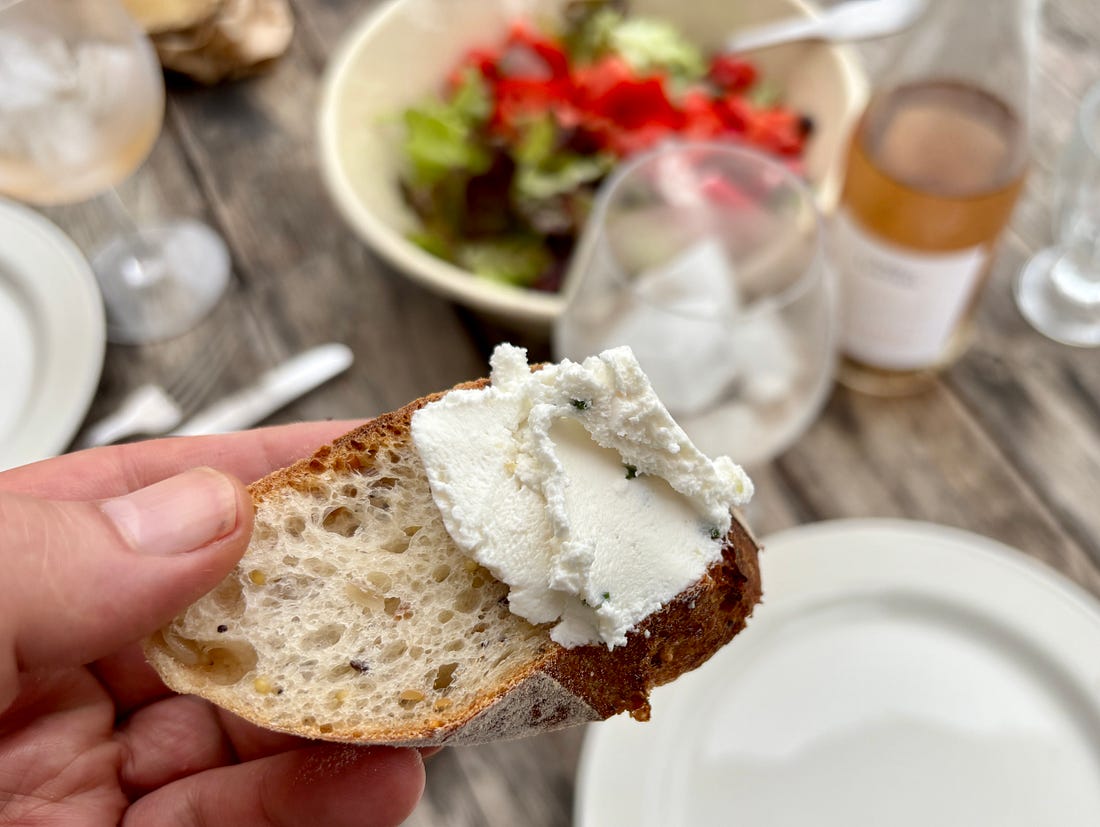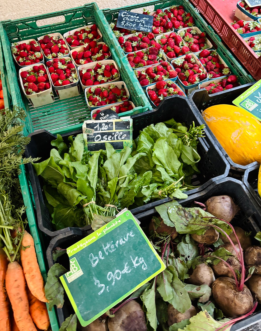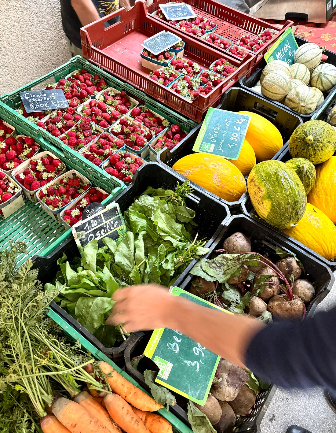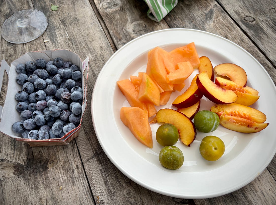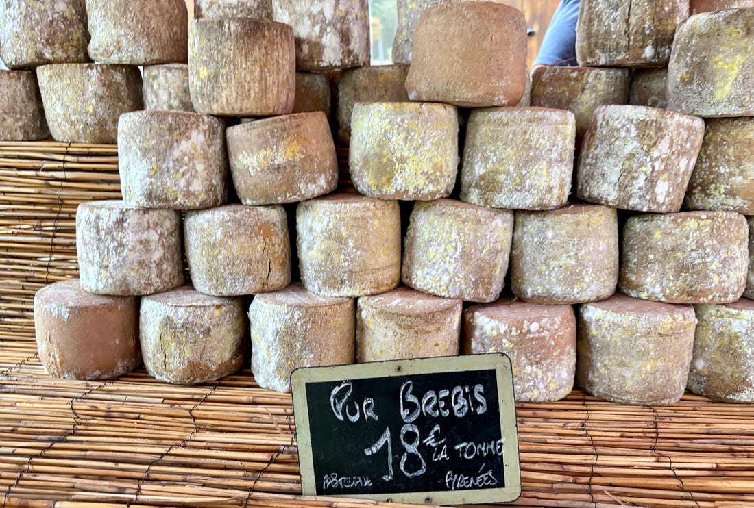 While I generally send out a monthly newsletter on the first of the month, we are out and about, enjoying a little vacation time. Unlike the juilettistes and aoûtiens, people in France who take their vacation in July or August, we like to take ours at the end of August, rather than in the middle of summer. Since we don’t have kids, our schedules aren’t tied to school vacations, so we’re free to go when we want to. Places are also a lot less crowded as summer draws to a close, which to me, means it’s a great time to travel. L’Occitanie (Occitania) doesn’t get the same publicity as Provence, but it’s the southernmost region of France, and the Languedoc-Roussillon is the largest winemaking region in the world. We started coming here during Covid-19, when the country’s borders were closed and a good friend who used to live in France, but moved back to California, couldn’t make it back and kindly gave us her guest house to vacation in. We’ve been coming ever since. One highlight of coming to the area where we’re staying is the market in Olonzac, which takes place Tuesday mornings. Unlike the markets in Paris, which don’t get going until 9am or so, people arrive at this market early and we try to be there by 8:30am, before it gets too crowded and all the good stuff is gone. The produce at this market is truly gorgeous and almost all of it is sold by producteurs, producers who actually grow it, rather than négociants, middlemen who buy and resell produce at the market. So the quality is really high and everything is super fresh and packed with flavor. One specialty of the region is pink garlic, which is dewy pink and rock-hard, and is sold tied in bundles. Because of the way it’s dried, pink l’ail rose keeps for months and we always buy a few bunches to bring back to Paris, which we use in the fall and even in the winter. Romain can’t resist girolles (below), and while many that are sold in France come from other countries, people prefer to buy wild mushrooms from France. Some of it is a holdover of concerns that mushrooms grown elsewhere contain radiation from Chernobyl, so buying ones that grew in France, to this day, is more reassuring. We bought a few baskets of them, along with eggs from a local producer (6 eggs for €1,90, about $2.25), to make an omelet. Unlike some people, I don’t really feel the need to do a lot of cooking while on vacation. When a chef turned his nose up at us at Chez Panisse, calling what we do “shopping, not cooking,” we took that as a compliment since good cooking begins with shopping. Not doing anything more to great ingredients than necessary and letting their flavors shine is the best way to prepare them. It’s been brutally hot in the south of France this summer (we also had major heat waves again in Paris), with neighbors in the village where we are staying telling us that the heat this summer was especially “intolerable.” The hottest it’s gotten while we were here has been 30ºC (86ºF), which isn’t as crazy-hot as it was, but still, we’re eating mostly salads and lots of fruits and vegetables. Speaking of heat, people get a little weird when you mention adding ice to wine, but as my friend Rosa Jackson, who lives in Nice, once told me, “People here consider rosé a drink, not necessarily wine.” When I was in Corsica, locals were plunking ice cubes into their glasses of red wine — “It’s too hot to drink it any other way!” — they said. And a friend (who is in the wine business) has a Burgundian mother who always adds water to her wine because it’s “too strong” for her. The first time I had a wine “drink” was when I went to Italy back in 2007 and noticed people drinking something orange and sparkly, served in big goblets over lots of ice, which eventually became known around the world as the Aperol Spritz. That wasn’t the first time I had one. Before then, back in the States, people were drinking white wine with sparkling water added to it, known as a Spritzer. (If I remember, it was considered a diet drink too.) Today, some cultures make similar drinks, adding soda, like Coca-Cola, to wine, such as the Kalimotxo, or Tinto de Verano, a mix of lemon soda and red wine. My rule for adding things to wine, such as ice and sparkling water, is that if the wine costs €10/$10 or less per bottle, you can do whatever you want to it. I like drinking rosé in the summer, but when it’s really hot, it goes down a little too easily, so a handful of ice and sometimes a splash of sparkling water make it extra refreshing and keeps it enjoyable, while lowering the strength. When we arrive at the Olonzac market, after parking the car, we make a beeline for Valerie’s stand, which has the most gorgeous and best-tasting produce that I’ve had in France. Especially good are her strawberries, which are sweet and delicate. Unlike commercial berries, you have to be careful packing them in your bag as they smoosh easily. People in the comments were shocked by the price of strawberries at the greenmarket that I posted pictures of when I was in New York City: But picking strawberries is backbreaking work since they grow low to the ground. Good strawberries (not the rock-hard ones sold in plastic clamshell baskets) only last about a day, and if it rains and you’re growing the berries organically, your crop can be ruined by mold. Good strawberries, the delicate kind with flavor, are a lot of work to grow and harvest, plus the growers get up at whatever time they need to in order to bring everything to the market by 7am, then spend the day on their feet selling them. Valerie drives an old white truck, not a Mercedes. In the south of France, people aren’t afraid of a little heat, at least in their cooking. While it’s funny to see chile peppers sold individually, I appreciate that people grow and offer fresh chiles. The cayenne peppers I planted in Paris were devastated by slugs this year, but I’ve got two 