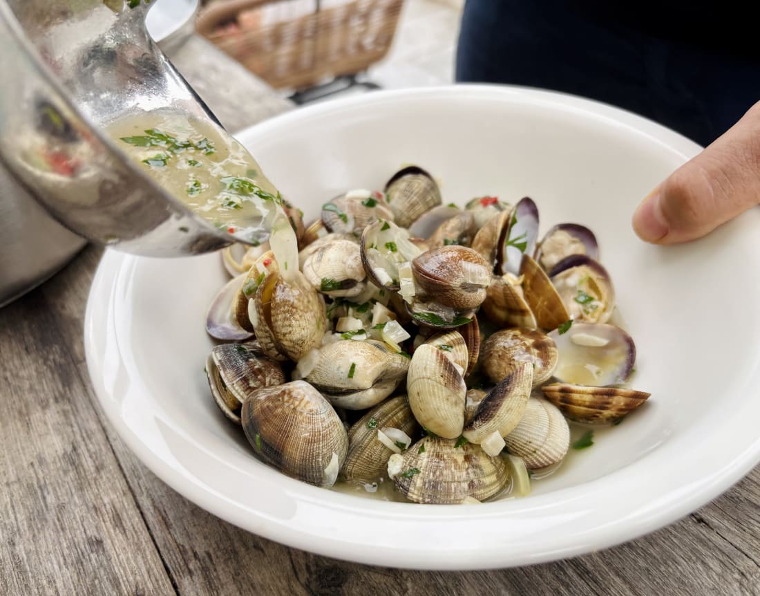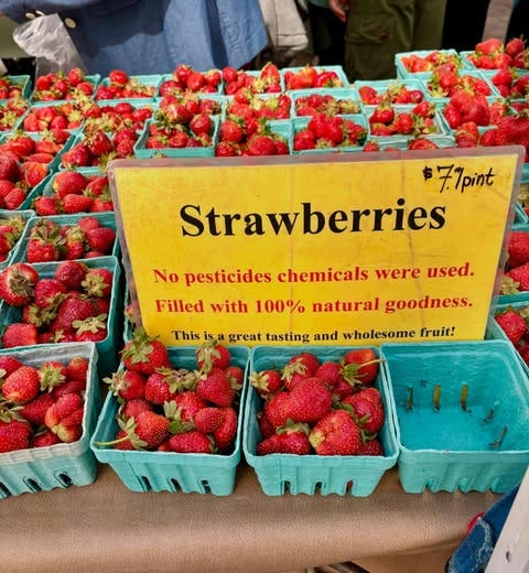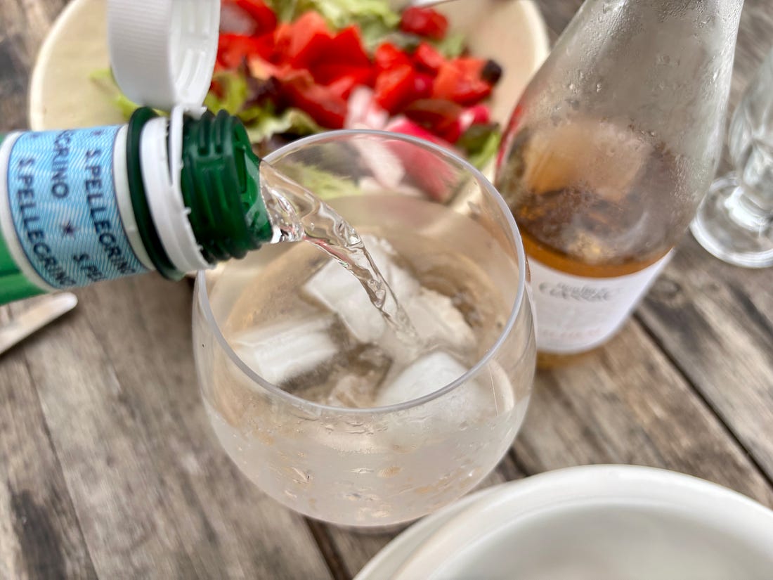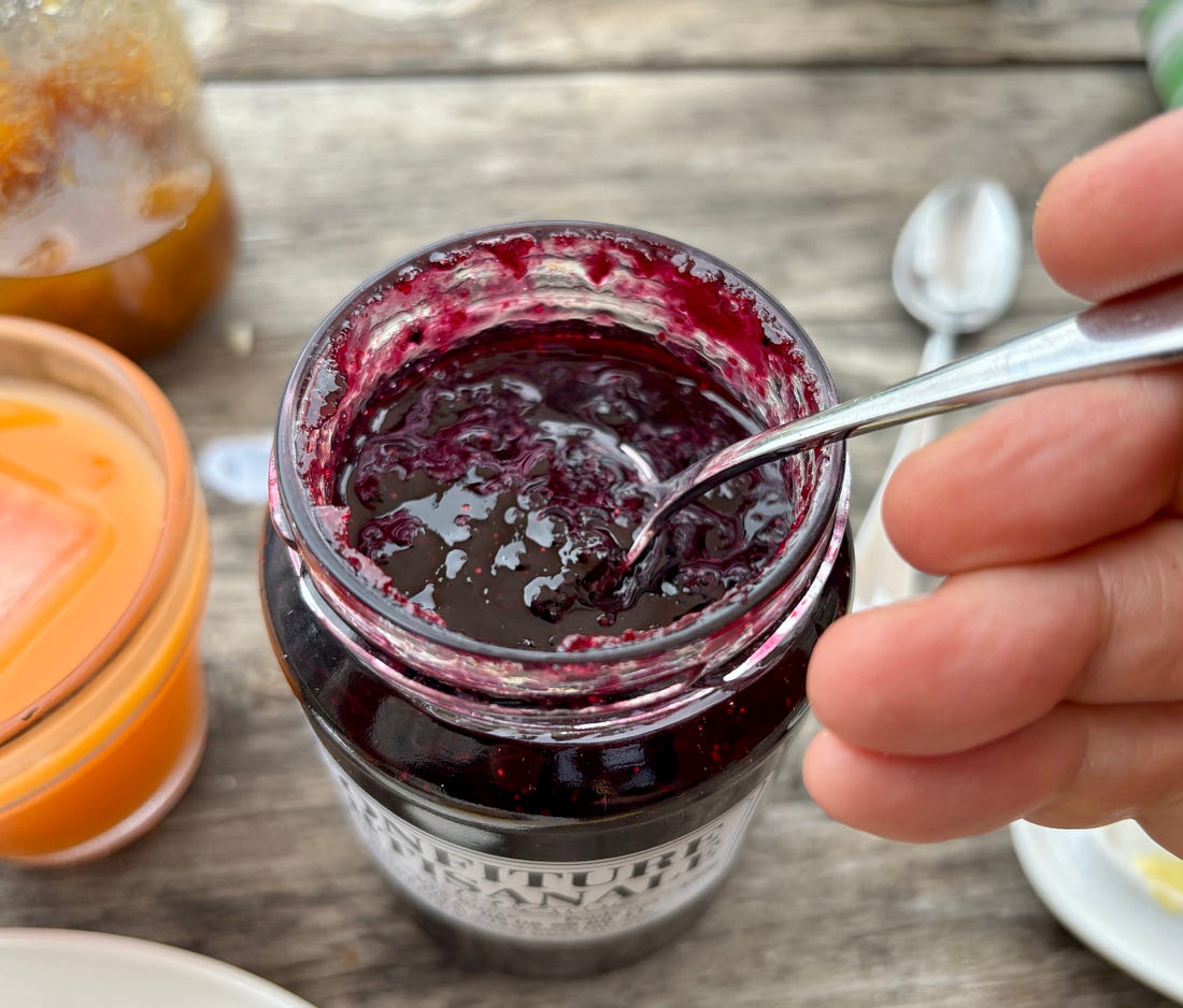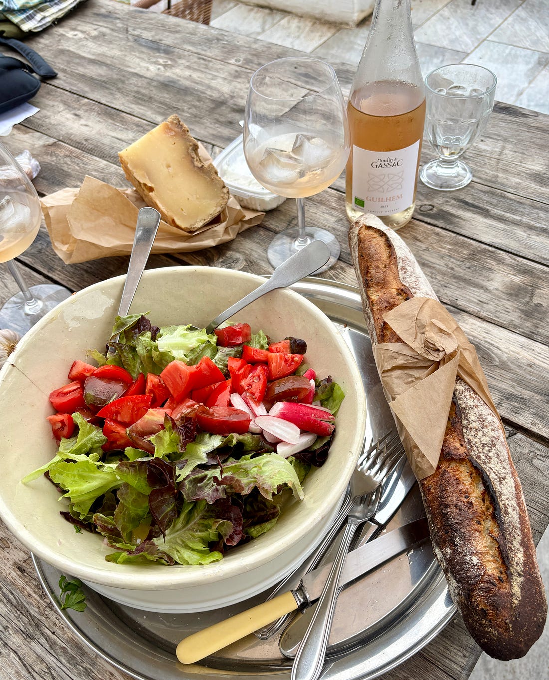 While I generally send out a monthly newsletter on the first of the month, we are out and about, enjoying a little vacation time. Unlike the juilettistes and aoûtiens, people in France who take their vacation in July or August, we like to take ours at the end of August, rather than in the middle of summer. Since we don’t have kids, our schedules aren’t tied to school vacations, so we’re free to go when we want to. Places are also a lot less crowded as summer draws to a close, which to me, means it’s a great time to travel. L’Occitanie (Occitania) doesn’t get the same publicity as Provence, but it’s the southernmost region of France, and the Languedoc-Roussillon is the largest winemaking region in the world. We started coming here during Covid-19, when the country’s borders were closed and a good friend who used to live in France, but moved back to California, couldn’t make it back and kindly gave us her guest house to vacation in. We’ve been coming ever since. One highlight of coming to the area where we’re staying is the market in Olonzac, which takes place Tuesday mornings. Unlike the markets in Paris, which don’t get going until 9am or so, people arrive at this market early and we try to be there by 8:30am, before it gets too crowded and all the good stuff is gone. The produce at this market is truly gorgeous and almost all of it is sold by producteurs, producers who actually grow it, rather than négociants, middlemen who buy and resell produce at the market. So the quality is really high and everything is super fresh and packed with flavor. One specialty of the region is pink garlic, which is dewy pink and rock-hard, and is sold tied in bundles. Because of the way it’s dried, pink l’ail rose keeps for months and we always buy a few bunches to bring back to Paris, which we use in the fall and even in the winter. Romain can’t resist girolles (below), and while many that are sold in France come from other countries, people prefer to buy wild mushrooms from France. Some of it is a holdover of concerns that mushrooms grown elsewhere contain radiation from Chernobyl, so buying ones that grew in France, to this day, is more reassuring. We bought a few baskets of them, along with eggs from a local producer (6 eggs for €1,90, about $2.25), to make an omelet. Unlike some people, I don’t really feel the need to do a lot of cooking while on vacation. When a chef turned his nose up at us at Chez Panisse, calling what we do “shopping, not cooking,” we took that as a compliment since good cooking begins with shopping. Not doing anything more to great ingredients than necessary and letting their flavors shine is the best way to prepare them. It’s been brutally hot in the south of France this summer (we also had major heat waves again in Paris), with neighbors in the village where we are staying telling us that the heat this summer was especially “intolerable.” The hottest it’s gotten while we were here has been 30ºC (86ºF), which isn’t as crazy-hot as it was, but still, we’re eating mostly salads and lots of fruits and vegetables. Speaking of heat, people get a little weird when you mention adding ice to wine, but as my friend Rosa Jackson, who lives in Nice, once told me, “People here consider rosé a drink, not necessarily wine.” When I was in Corsica, locals were plunking ice cubes into their glasses of red wine — “It’s too hot to drink it any other way!” — they said. And a friend (who is in the wine business) has a Burgundian mother who always adds water to her wine because it’s “too strong” for her. The first time I had a wine “drink” was when I went to Italy back in 2007 and noticed people drinking something orange and sparkly, served in big goblets over lots of ice, which eventually became known around the world as the Aperol Spritz. That wasn’t the first time I had one. Before then, back in the States, people were drinking white wine with sparkling water added to it, known as a Spritzer. (If I remember, it was considered a diet drink too.) Today, some cultures make similar drinks, adding soda, like Coca-Cola, to wine, such as the Kalimotxo, or Tinto de Verano, a mix of lemon soda and red wine. My rule for adding things to wine, such as ice and sparkling water, is that if the wine costs €10/$10 or less per bottle, you can do whatever you want to it. I like drinking rosé in the summer, but when it’s really hot, it goes down a little too easily, so a handful of ice and sometimes a splash of sparkling water make it extra refreshing and keeps it enjoyable, while lowering the strength. When we arrive at the Olonzac market, after parking the car, we make a beeline for Valerie’s stand, which has the most gorgeous and best-tasting produce that I’ve had in France. Especially good are her strawberries, which are sweet and delicate. Unlike commercial berries, you have to be careful packing them in your bag as they smoosh easily. People in the comments were shocked by the price of strawberries at the greenmarket that I posted pictures of when I was in New York City: But picking strawberries is backbreaking work since they grow low to the ground. Good strawberries (not the rock-hard ones sold in plastic clamshell baskets) only last about a day, and if it rains and you’re growing the berries organically, your crop can be ruined by mold. Good strawberries, the delicate kind with flavor, are a lot of work to grow and harvest, plus the growers get up at whatever time they need to in order to bring everything to the market by 7am, then spend the day on their feet selling them. Valerie drives an old white truck, not a Mercedes. In the south of France, people aren’t afraid of a little heat, at least in their cooking. While it’s funny to see chile peppers sold individually, I appreciate that people grow and offer fresh chiles. The cayenne peppers I planted in Paris were devastated by slugs this year, but I’ve got two 