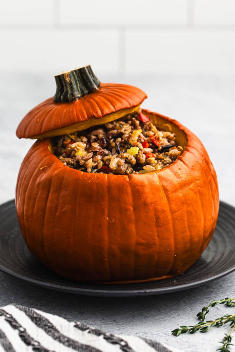 #2 Dinner in a Pumpkin Made with Italian sausage, wild rice, and vegetables – a fun, healthy, and delicious way to celebrate Halloween!