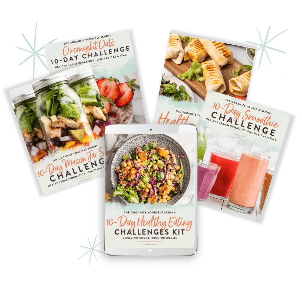 If your eating habits are way off track, this kit is the perfect place to start. It's the easiest, most effective way to reset your routine and make healthy eating feel doable again. You'll get four 10-day challenge guides—Smoothies, Mason Jar Salads, Overnight Oats, and Healthy Dinners—plus all the recipes, grocery lists, and prep tips you need to stay consistent all week long.