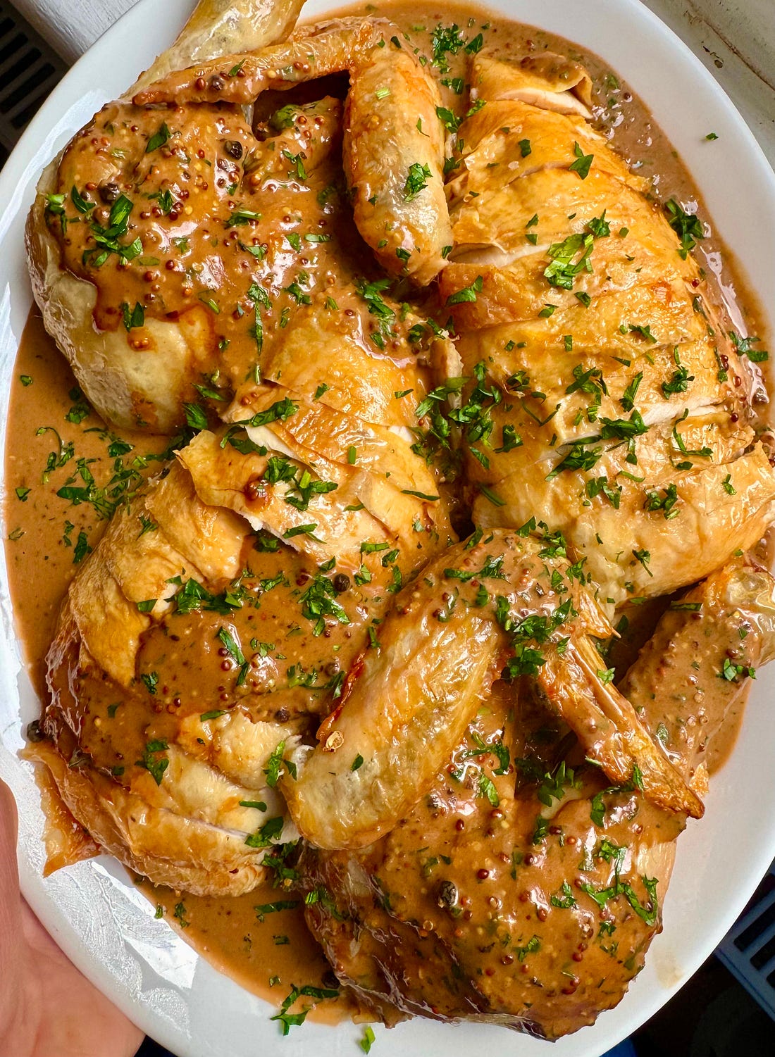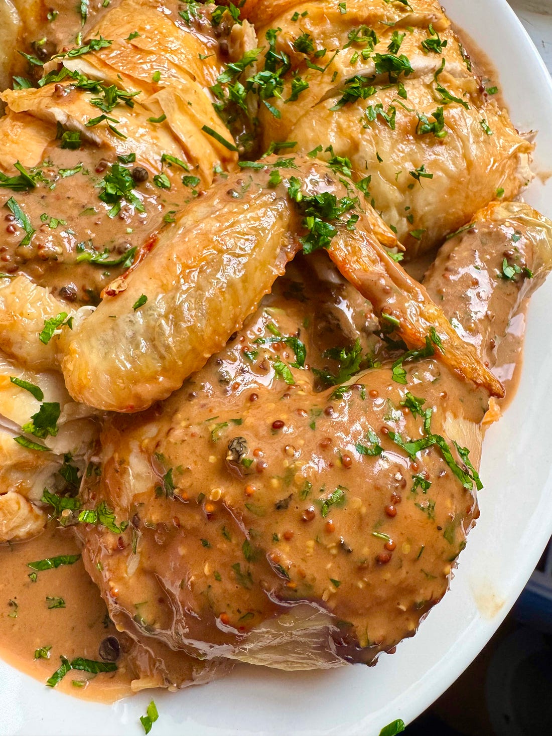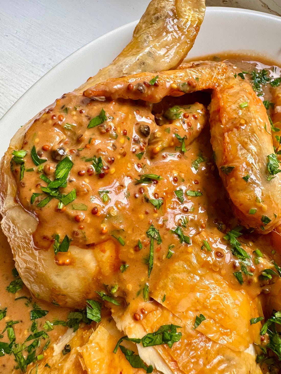 Flavour Nugget #52: A fun and addictive fully-devilled sauceWhen life gives you lemons, punch it in the face.You know how, last week, I said I couldn’t believe how hard life was life-ing? My head has been swirling! The numbness of unexpected life events is a weird sensation, like having a lucid dream and taking a Turbo Mitsubishi at the same time. My nervous system has valid questions. One thing I’m feeling quite determined about, though, is looking after myself physically, because this hasn’t always been my default, and I’m too familiar with the aftereffects. I’m too old and - sod it - too wise, to go down the path of pummeling my emotions into submission with junk and booze. I’ve done it one hundred too many times. We all know that exercise and eating decent food will help us navigate life better, but doing it is another matter. How to manage it when you just can’t… manage it? Walking is good. Putting one foot in front of the other is as basic as it comes, and sometimes it’s all we’ve got, literally and metaphorically. Plod, plod, plod. Progress will be made. Movement can only drive us forward. My mate and I spent time this week chatting about what 'luxury’ actually means (long story), and it got me thinking that, actually, a luxury might be taking time to cook something that will nourish me and then putting that food in my body. Gen Z would call this ‘self-care’, I know, and I don’t have any issues with that term whatsoever, but I think I’m taking a slightly different perspective. There’s something a bit too routine about the words ‘self-care’ for my mental state this week; I want to feel actively thoughtful. I want to make some considered yet ball-bustingly insightful moves towards treating the living shit out of myself. Which is how I arrived at this devilled sauce. It is fully charged. A spicy sluice. The foundation is really a peppercorn sauce, but I wanted to take it in a different direction with the added sriracha and mustard to make something fully rounded in its attack, and I wanted to sack off the whole flour and butter stage at the beginning. So this is easy and full throttle. It’s tangy as anything and flecked through with nubbins of pepper, which are numbed a little from their simmer yet still potent as a snakebite. One of the best ways to eat this is over steak, of course, but it is also fantastic on soft-boiled eggs and/or potatoes or, as you see here, on chicken. There are few comforts as effective (for me) as a roast chicken, and this feels like a new way to eat it; the tongue-tingling equivalent of riding a zip wire, as if I needed extra stimulation. Fully Devilled Sauce 200ml beef stock Transfer one-third of the peppercorns to a pestle and mortar and crush them roughly. Combine the cream, beef stock and all the peppercorns in a pan, bring to the boil and allow to bubble and reduce by half. Add the garlic, Worcestershire, sriracha and mustard, mix well and allow to cook gently for a few minutes to remove any rawness in the garlic. Taste and season with salt, if needed. Stir through the parsley.