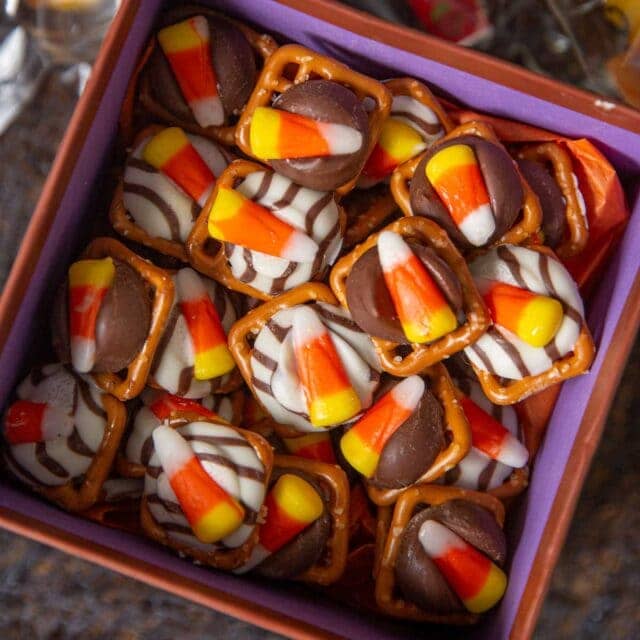 Halloween Pretzel Hugs are a fun, easy-to-make treat for spooky fall parties! A kid-friendly snack made with Hersey Kisses, pretzel squares, and candy corn.