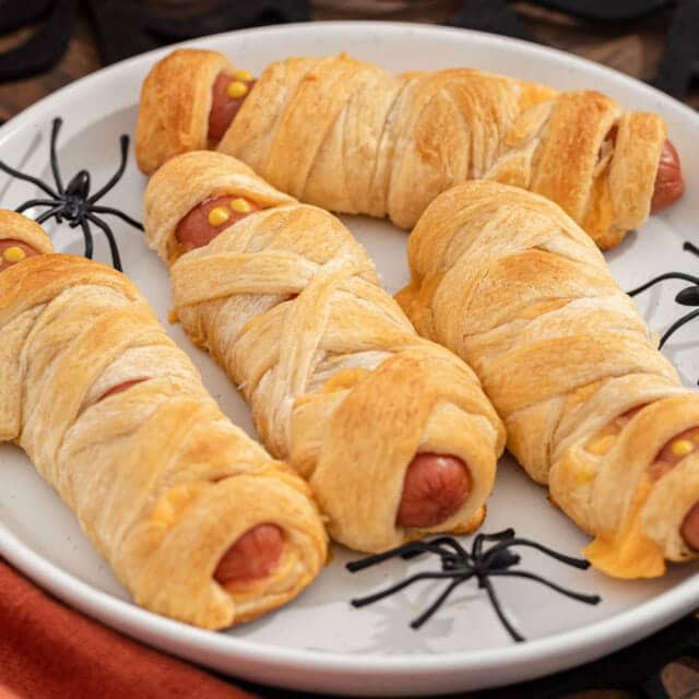 Mummy Hot Dogs are the ultimate kid-friendly Halloween recipe! A festive and fun twist on pigs in a blanket. You can serve them full-size, or wrap cocktail wieners in pastry for a bite-sized party version.
