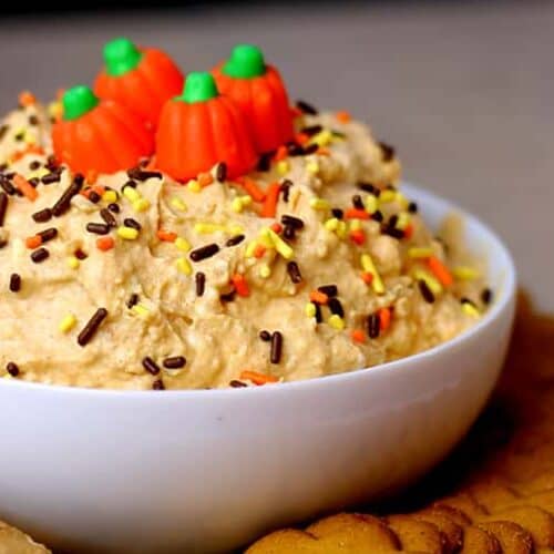 A sweet and salty snack made in minutes with chocolate chips, pretzels, peanuts, and candy. The orange and yellow Reese's Pieces give the bowl a festive color scheme!