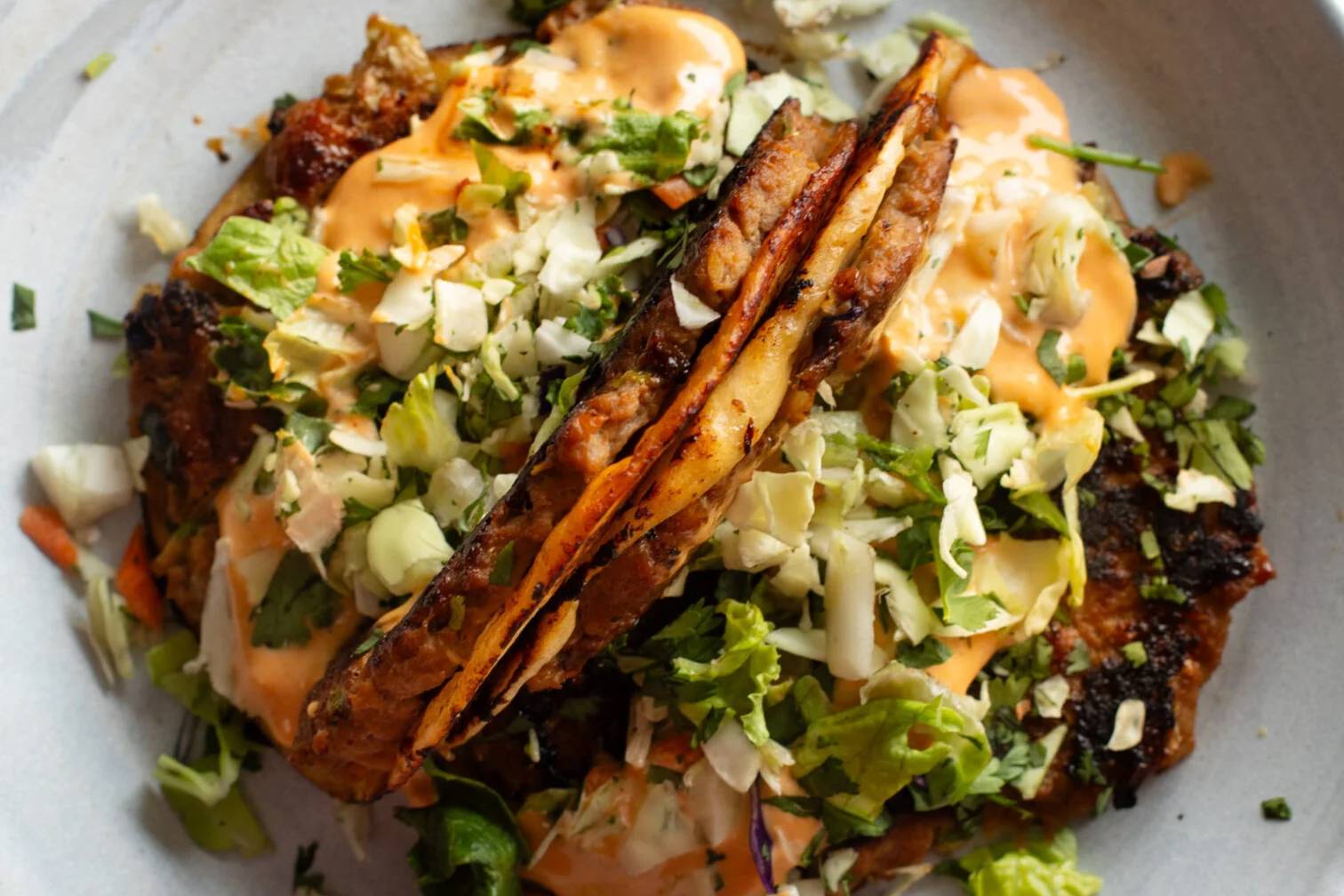 Egg rolls meet tacos! I love this! Easy to make and ridiculously good with a classic egg roll filling, crunchy veg, pillowy tortillas, and a spicy gochujang sauce.