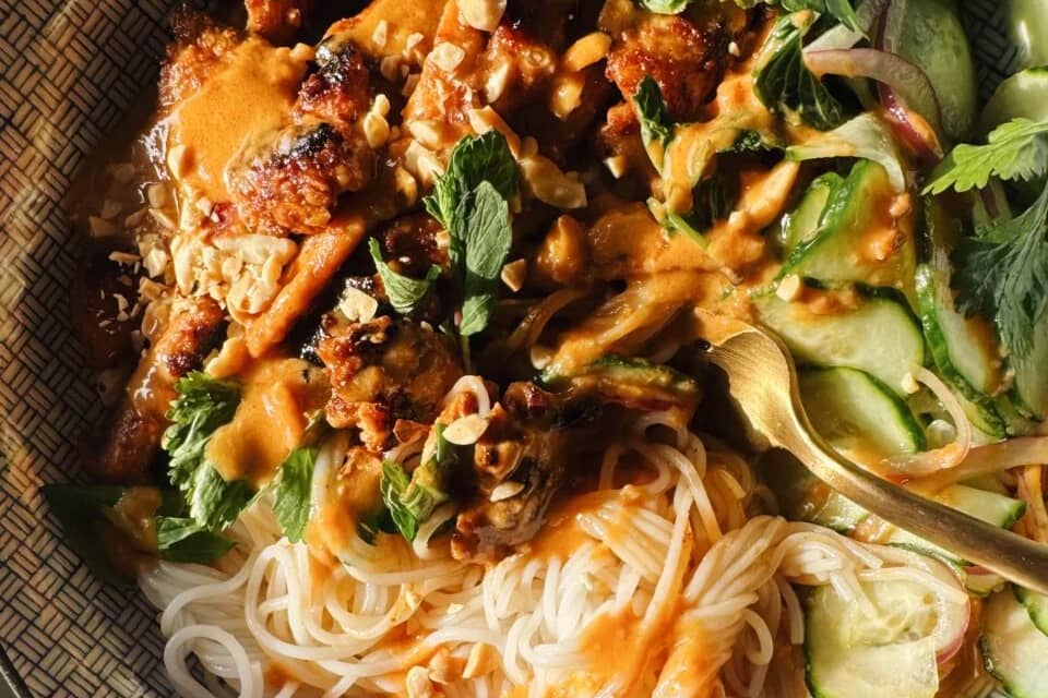 Love a shortcut dinner hack! These bowls feature pan-fried caramelized peanut chicken, a tangle of vermicelli noodles, fresh herbs, cucumber salad, and the easiest peanut sauce all over top.