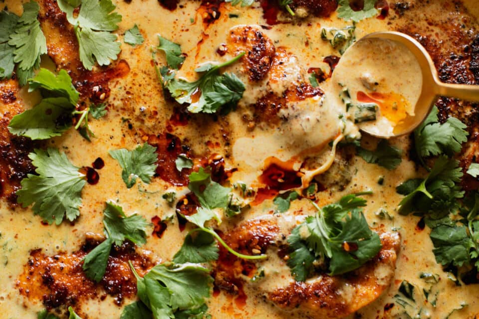 Golden, juicy, thinly sliced pan-fried chicken swims in a creamy coconut-kale gravy-like situation with slips of shallot and a bit of heat. Super easy, minimal ingredients!