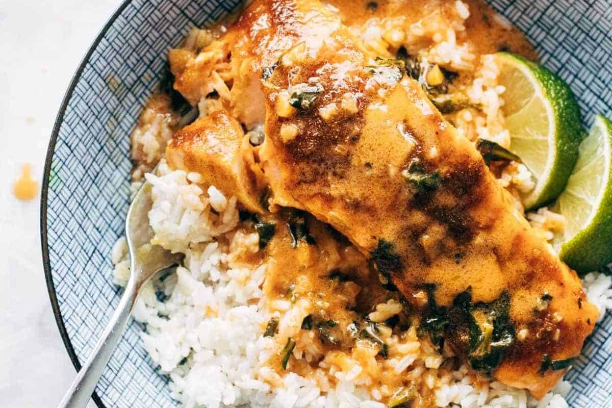 This feels like exactly what I need to come out of the bland food haze. Spice-rubbed salmon, creamy coconut curry sauce, and spinach simmered right in. Protein, veg, carbs, flavor, it's got it all!