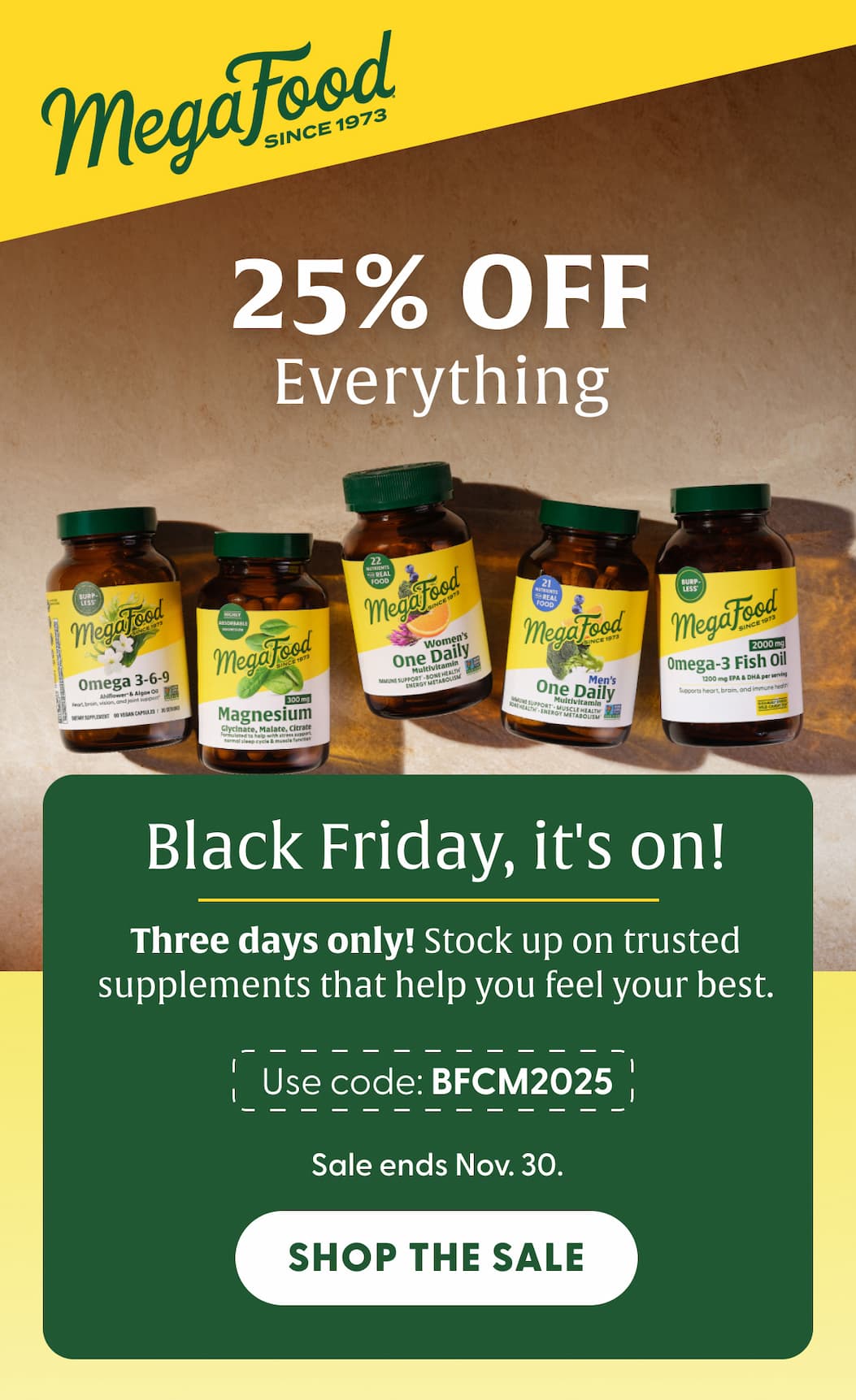 †These statements have not been evaluated by the Food and Drug Administration. This product is not intended to diagnose, treat, cure or prevent any disease. | | Offer not valid toward shipping, handling, or tax. Offer is not retroactive for orders placed prior to receiving the offer. Not valid in combination with any other coupons, discounts, specials, vouchers, rewards points, redemption codes or promotions. Not valid on subscriptions. No cash value. Online orders only, not valid on retail store purchases, or orders placed with customer service via phone, email or other medium. Prices subject to change and valid while supplies last. Valid on orders from MegaFood.com only. Offer ends 11/30/2025 at 11:59 pm PT. If you are a California resident, please see our Privacy Policy found on megafood.com for information on how we collect, use and disclose business contact information and your privacy choices. | | No longer want to receive these emails? Unsubscribe.MegaFood® PO Box 5244 Manchester, New Hampshire 03108 | | | | |