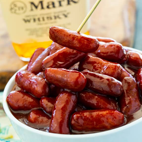 Crock Pot Bourbon Smokies- the salty smokiness of cocktail wieners combines wonderfully with a sweet and tangy sauce flavored with bourbon.